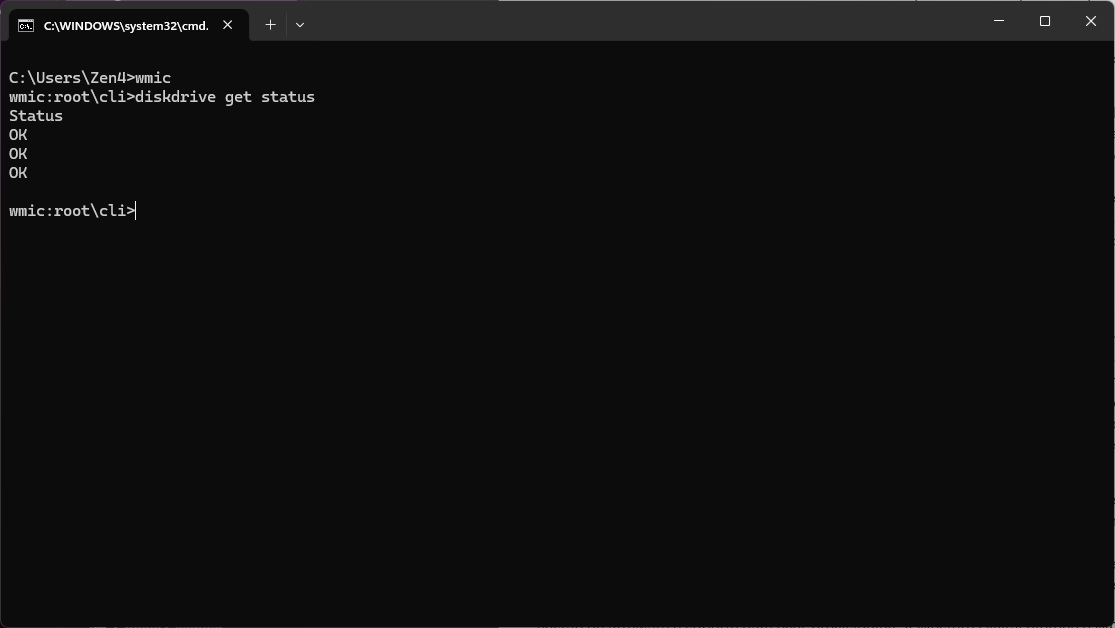 A forma mais rápida de obter um diagnóstico básico no Windows 10 ou Windows 11 é através da linha de comandos. Para isso, clique no botão de pesquisa na barra de tarefas, escreva "CMD" e pressione Enter para abrir a Linha de Comandos. De seguida, escreva "WMIC" e pressione Enter, e depois escreva "diskdrive get status" e pressione Enter novamente.