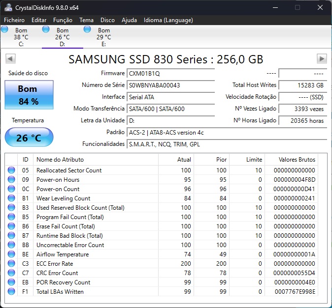 Para uma análise mais detalhada, a ferramenta mais popular é o CrystalDiskInfo, disponível gratuitamente no site do programador. Após a instalação, o programa apresenta automaticamente informação detalhada sobre todos as unidades do sistema, incluindo a temperatura atual, o número de horas de funcionamento, o total de dados escritos ao longo da vida útil e a percentagem de vida restante com base no desgaste acumulado das células de memória flash.