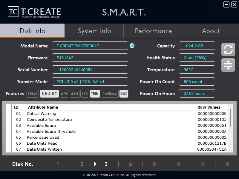 A Western Digital oferece o WD Dashboard, que serve o mesmo propósito para os seus discos, tal como a Kioxia tem o SSD Utility. Já a TeamGroup, com o seu SSD S.M.A.R.T. Tool, permite monitorizar unidades de outras marcas e permite realizar testes de desempenho, à semelhança do SeaTools da Seagate, que nos testes de diagnóstico, caso detete erros, tentar reparar blocos defeituosos. Embora este procedimento possa evitar perda de dados ao isolar as células defeituosas, recomendamos sempre a realização de uma cópia de segurança antes de executar qualquer operação de reparação.