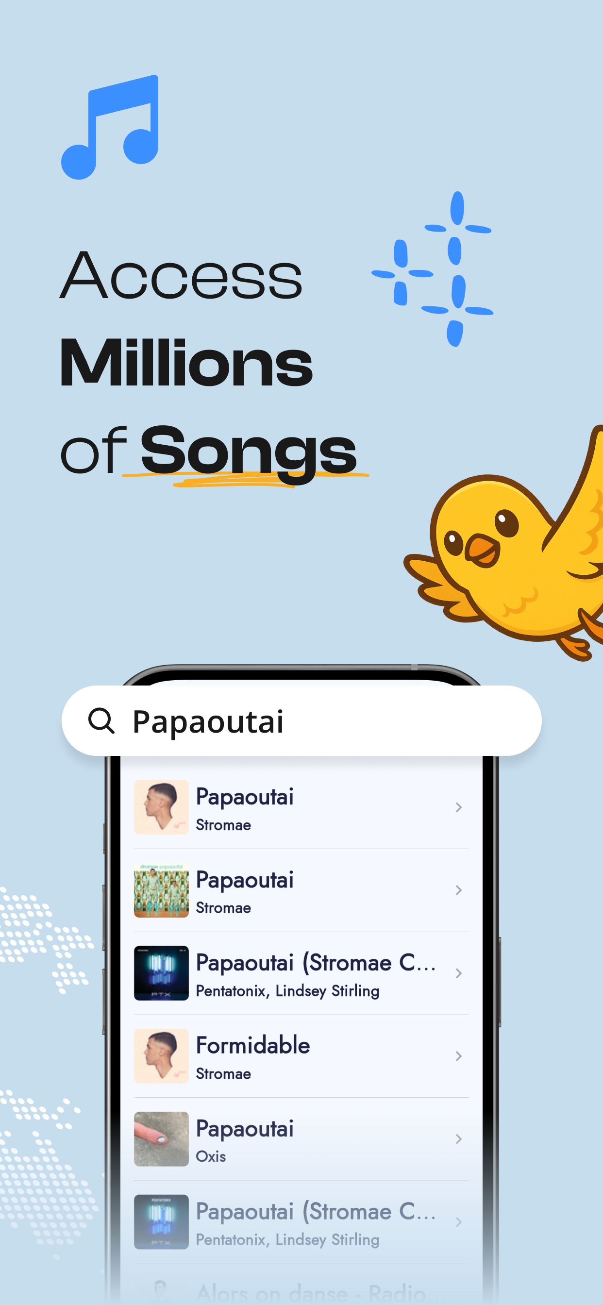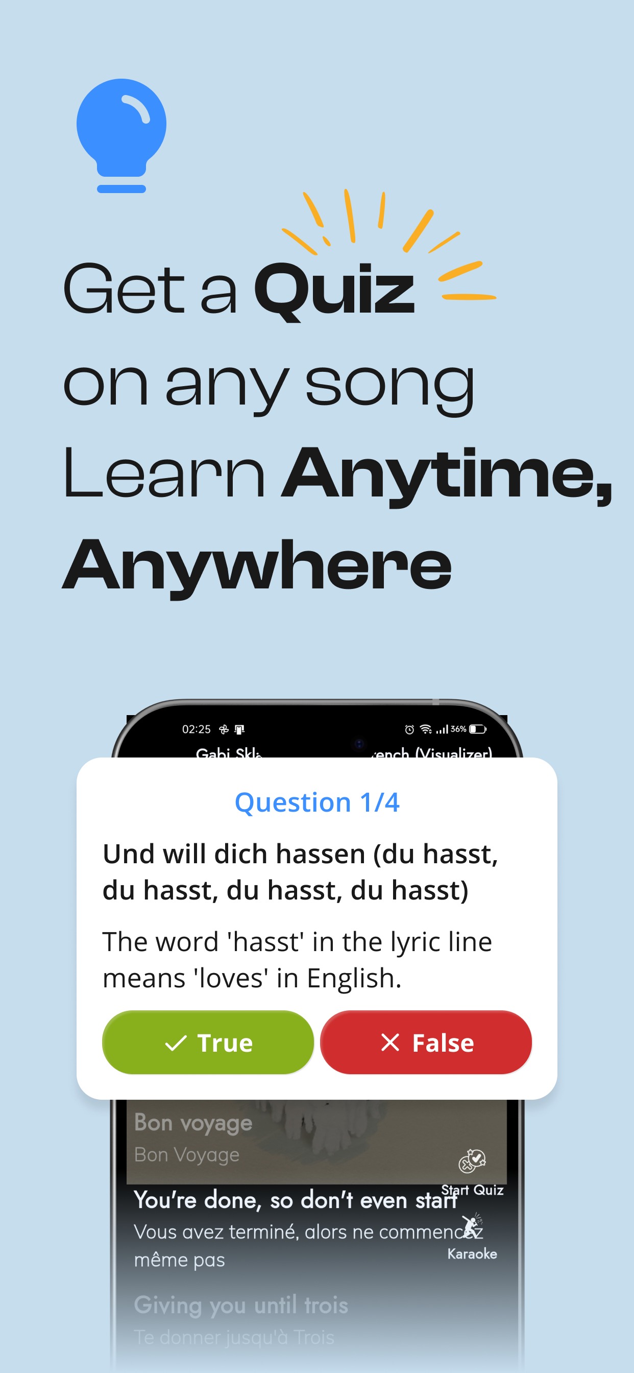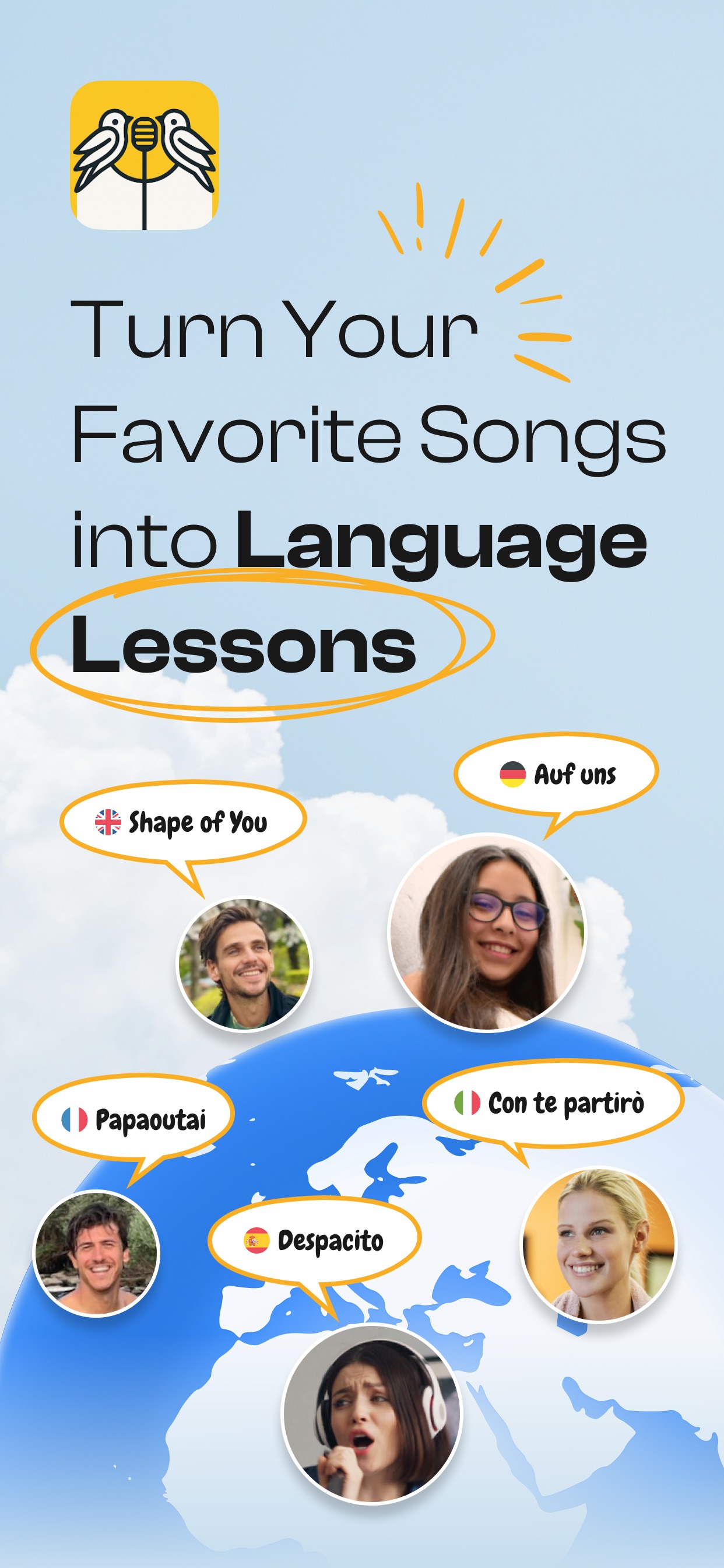 As músicas são apresentadas num feed semelhante ao do TikTok ou Reels do Instagram. Aqui há espaço para separadores dedicados a canções selecionadas para si, assim como a músicas populares no idioma que está a aprender. Se desejar, pode também adicionar canções a uma lista de favoritos.