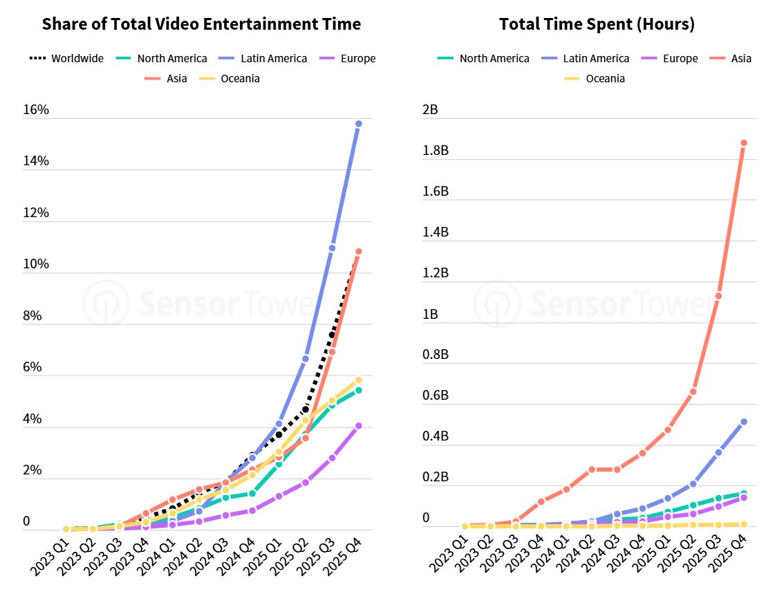 Apesar do boom em downloads e receita, o tempo total passado em apps de streaming cresceu apenas 8%, sinal de que o vídeo curto está a redistribuir a atenção existente mais do que a criar novos hábitos. A Ásia lidera em volume, mas a América Latina destaca-se como a região com crescimento mais rápido neste formato, enquanto a adoção na Europa e América do Norte permanece mais contida.