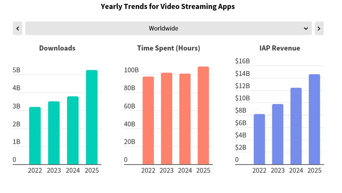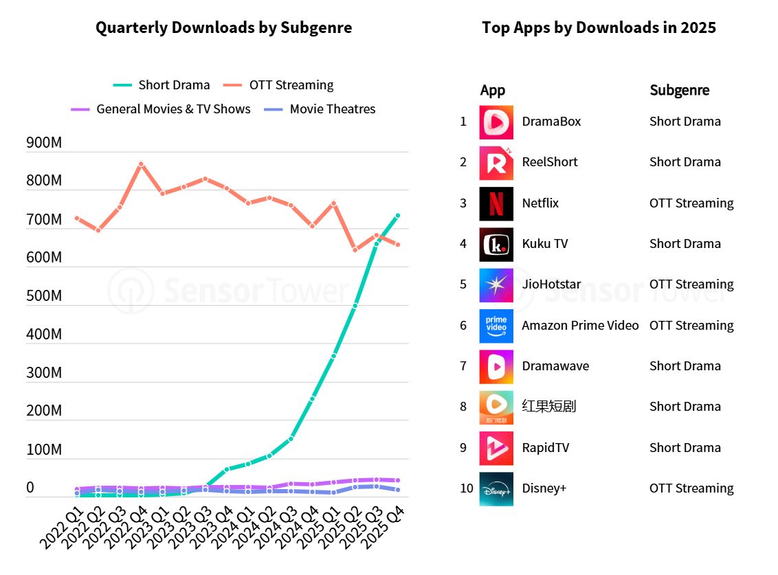 No vídeo, 2025 ficou marcado pela explosão do short drama, plataformas de séries com episódios de poucos minutos, pensadas para consumo rápido em mobile. Os downloads da categoria cresceram 39%, para um total de 2,3 mil milhões, superando claramente o streaming tradicional. No último trimestre, o crescimento anual chegou aos 186%, enquanto as plataformas OTT clássicas registaram uma quebra.
