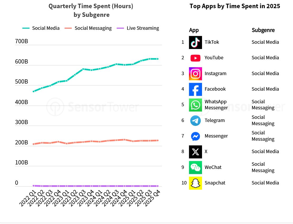 Depois de sinais de fadiga digital em 2024, o tempo passado em redes sociais estabilizou em 2025, atingindo 3,4 biliões de horas. Ainda assim, estas aplicações continuam a concentrar mais de 60% de todo o tempo gasto no mobile. O vídeo curto manteve-se central, com os Reels a representarem quase metade do tempo passado no Instagram.