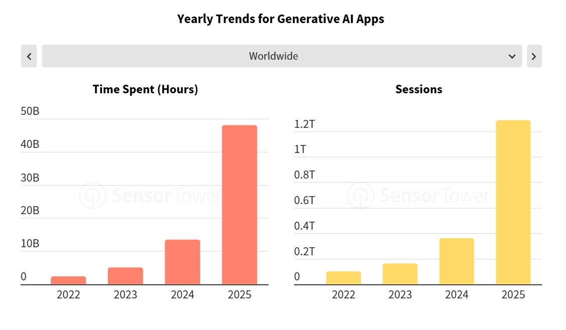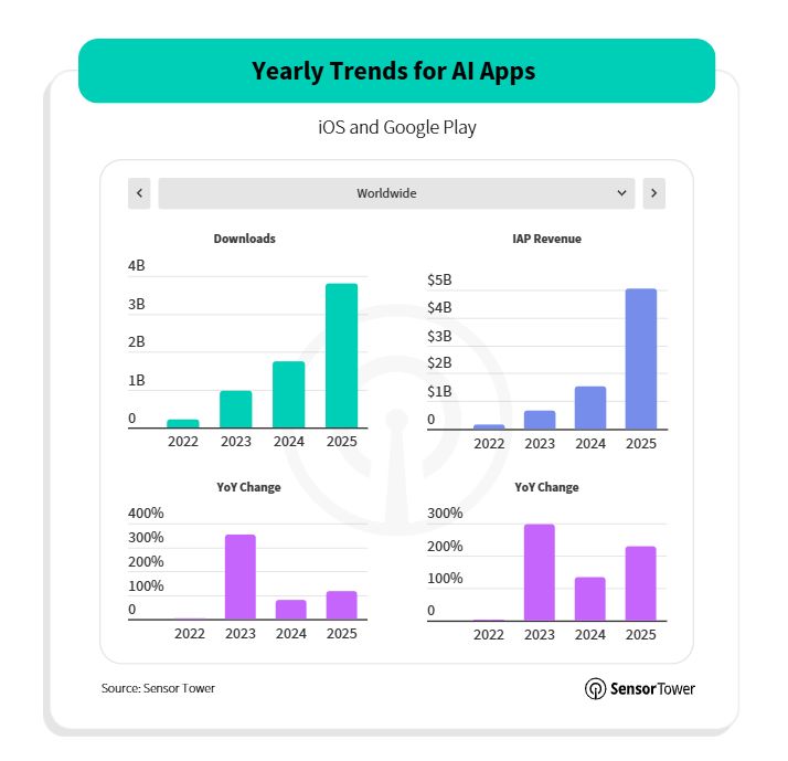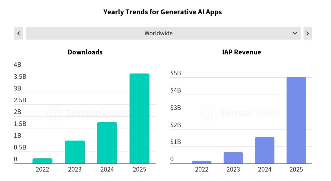 Se houve uma área que acelerou de forma clara em 2025 foi a inteligência artificial generativa. Os downloads de apps de IA duplicaram face ao ano anterior, atingindo 3,8 mil milhões, enquanto a receita mais do que triplicou, ultrapassando os 5 mil milhões de dólares (4,2 mil milhões de euros). O tempo passado nestas aplicações chegou às 48 mil milhões de horas, quase quatro vezes mais do que em 2024, sinal de que os utilizadores deixaram de “experimentar” IA para a integrar no dia a dia.
