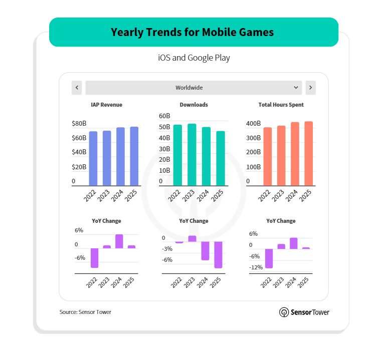 O mercado global de aplicações móveis voltou a crescer em 2025, mas de forma cada vez mais orientada para o valor. De acordo com o relatório State of Mobile 2026, da Sensor Tower, foram registados 149 mil milhões de downloads ao longo do ano, uma subida ligeira de 0,8%, equivalente a cerca de 284 mil aplicações descarregadas por minuto. Já a receita contou uma história diferente: os utilizadores gastaram 167 mil milhões de dólares em compras dentro das apps (139 mil milhões de euros), mais 10,6% do que em 2024.