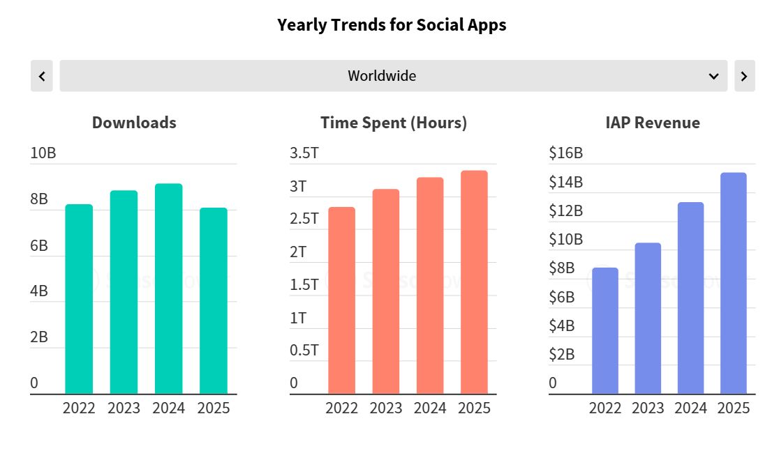 Ao mesmo tempo, as redes sociais reforçaram a aposta na monetização direta. A categoria foi a que mais receita gerou fora dos jogos, com 15 mil milhões de dólares, liderada por TikTok, YouTube e Snapchat, através de modelos que combinam subscrições, conteúdos pagos e compras pontuais.
