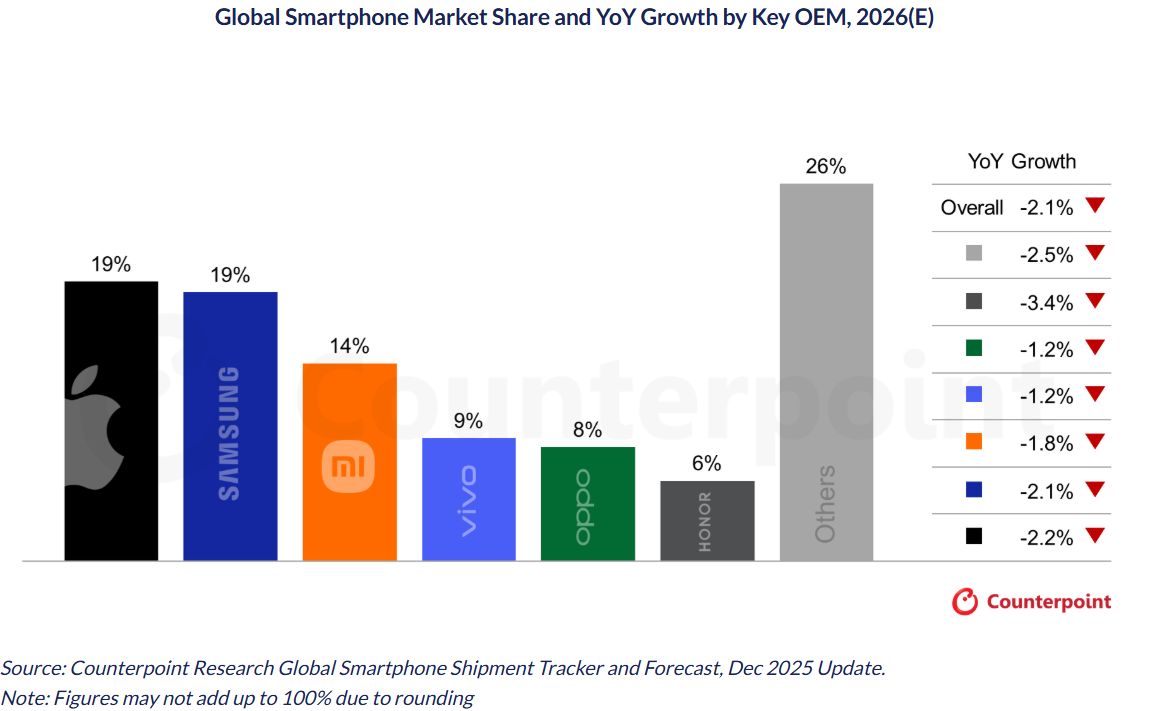 A fabricante sul-coreana fechou o ano com uma quota global de 19%, mesmo com o seu portfólio de equipamentos largamente mais extenso que o da Apple e a cobrir os diferentes segmentos de mercado. A Counterpoint já tinha dito que a posição agora conquistada pela Apple tende a manter-se, pelo menos, até 2029.