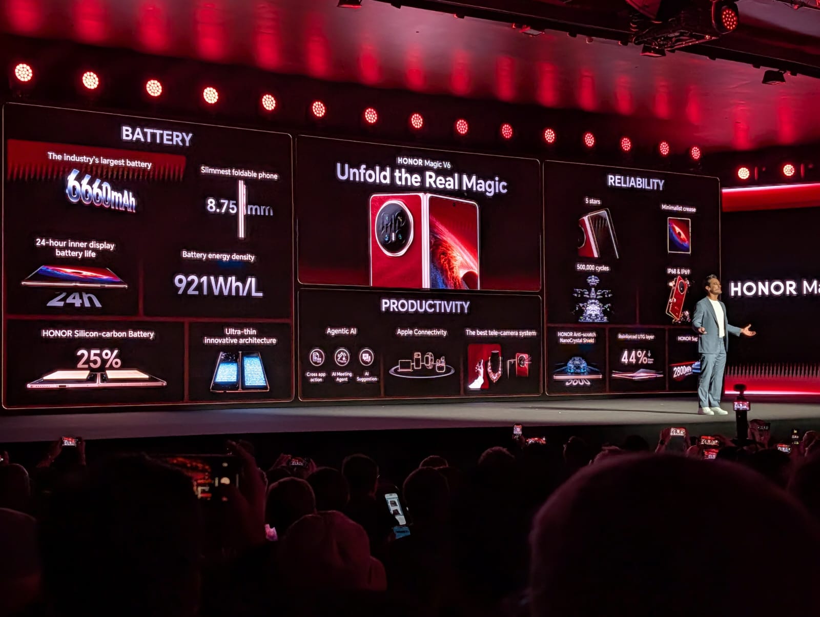 O vermelho é a cor que a Honor escolheu para destacar no seu novo smartphone dobrável, o Honor Magic V6, que mantém o design, com pequenas mudanças, mas melhora em algumas categorias essenciais, como a bateria e o ecrã. O smartphone é o protagonista principal da apresentação da Honor no Mobile World Congress 26, que só começa oficialmente amanhã mas que já movimenta Barcelona. A marca tomou conta do Centro de Congressos para uma das maiores apresentações do MWC.