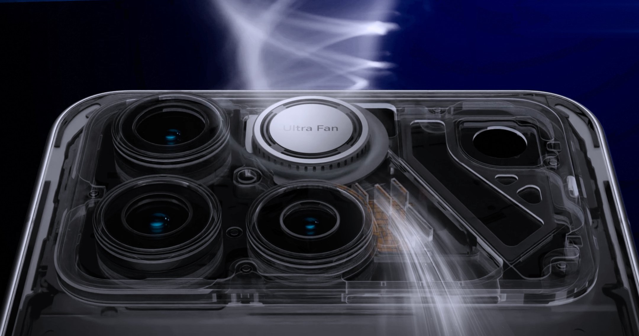 Atrás encontra-se presente um sistema com três sensores de imagem, um principal de 50 MP, um telefoto de 50 MP com zoom óptico de 3x, e uma ultra grande angular de 12 MP. Juntamente com os sensores de imagem encontra-se uma espécie de exaustor, que é na realidade a entrada de ar para o circuito de arrefecimento ativo deste equipamento.