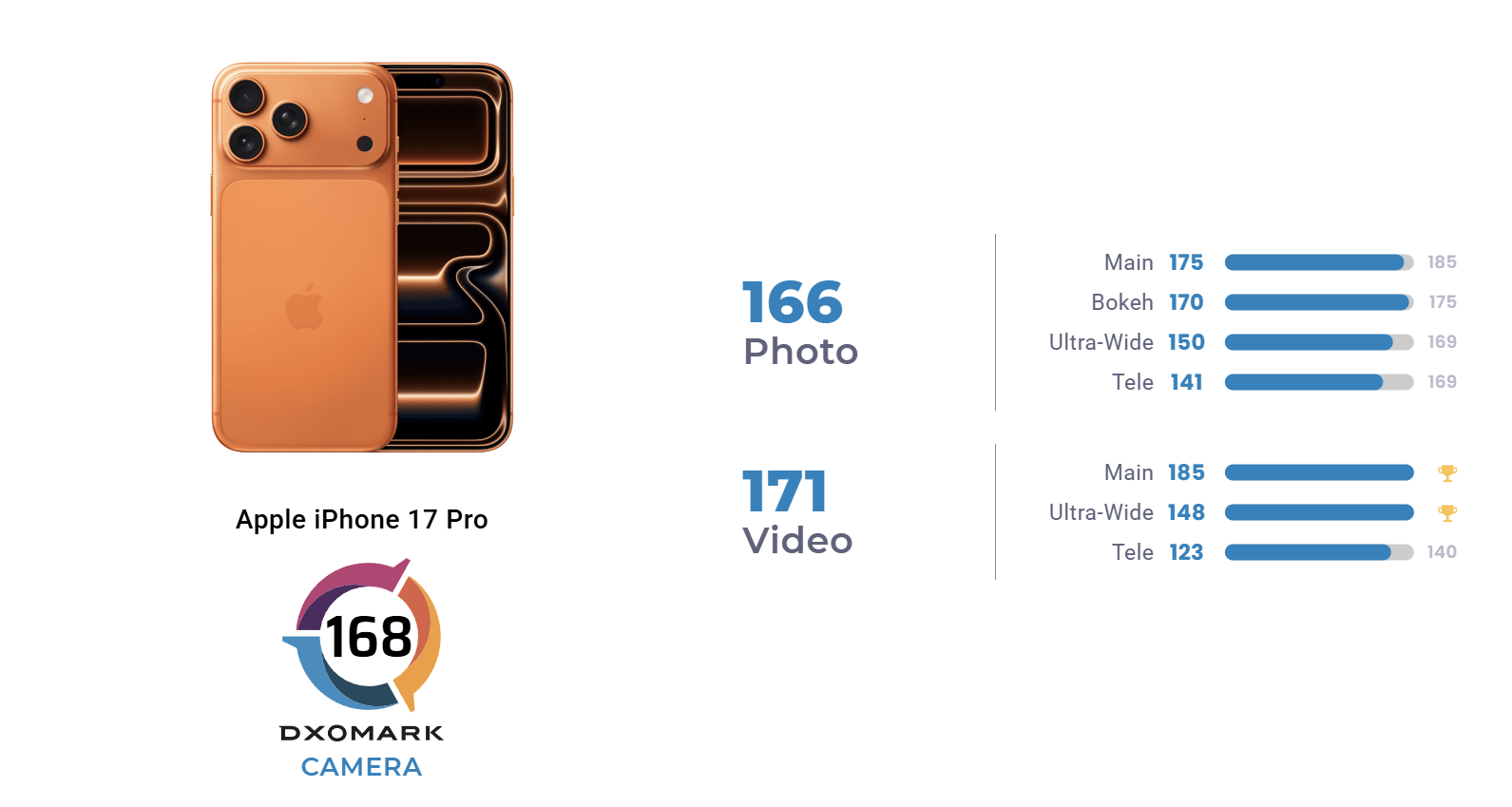 Nos campos individuais de pontuação, o iPhone 17 Pro obteve 184 pontos na captura de fotos e vídeos em exteriores, estabelecendo um novo máximo na categoria. No campo do vídeo estabeleceu também dois máximos, para a câmara principal (185 pontos) e ultra grande angular (148 pontos). No geral, a fotografia recebeu 166 pontos e o vídeo 171.