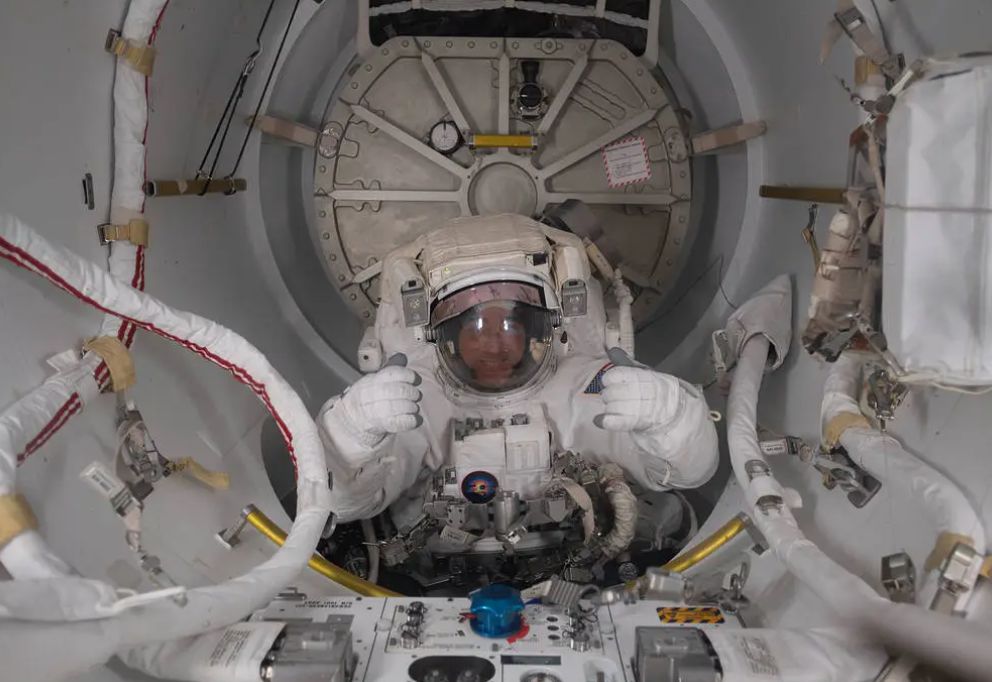 E, ao mesmo tempo, a engenheira de voo da NASA, Zena Cardman, organizou ferramentas para caminhadas espaciais, usando óculos de realidade virtual para treinar a utilização de um jetpack de emergência para trajes espaciais. Este jetpack - Simplified Aid For EVA Rescue, ou SAFER - permite que um astronauta regresse em segurança ao posto avançado orbital no caso improvável de se soltar.
