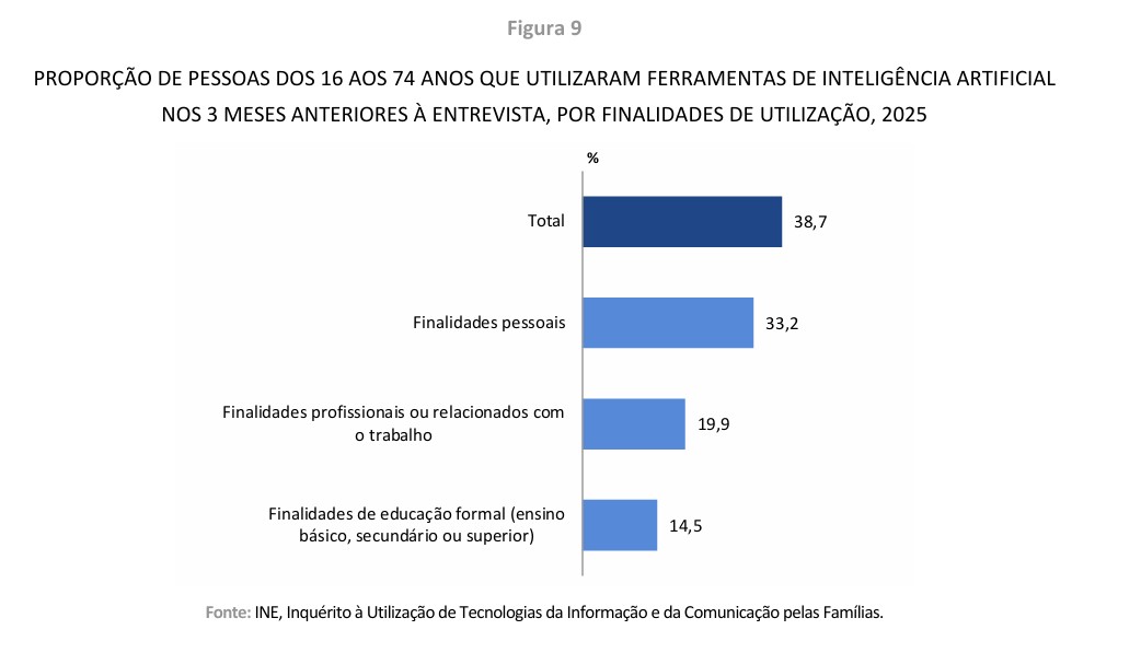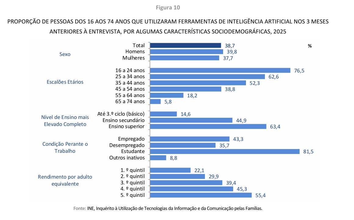 Segundo os dados avançados, 38,7% da população com idades entre os 16 e os 74 usou ferramentas de IA nos três meses anteriores ao inquérito para obter respostas ou criar texto, imagens, código de programação ou vídeo.