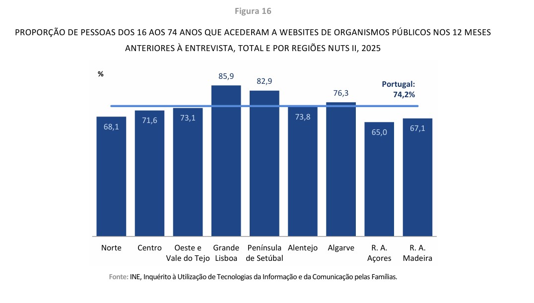 O INE nota que, em 2024, a proporção de pessoas em Portugal que contactaram com organismos públicos posicionava-se 5,9 pontos percentuais acima da média da UE-27 (70,0%).