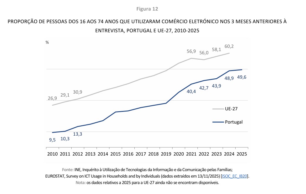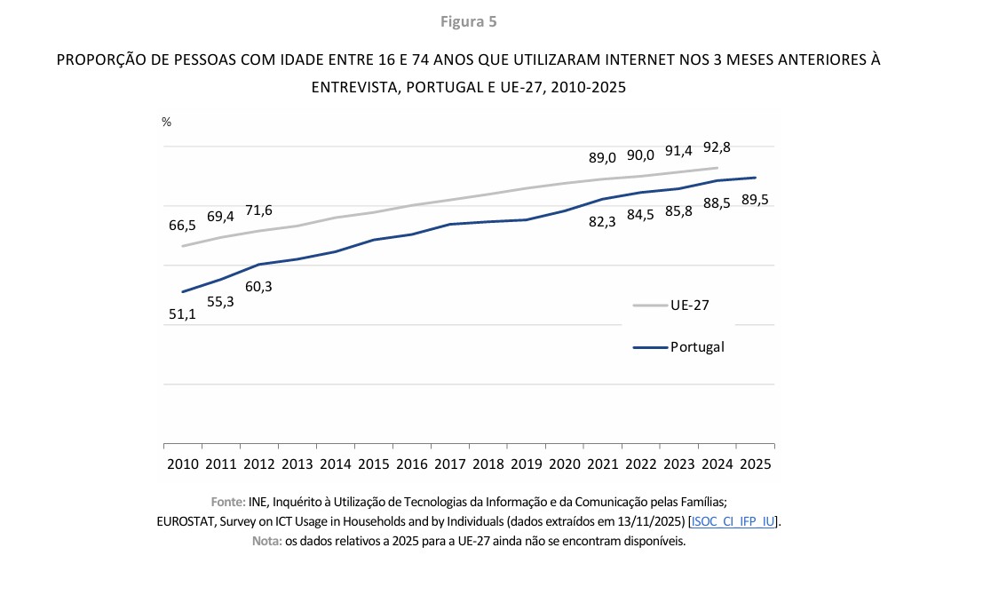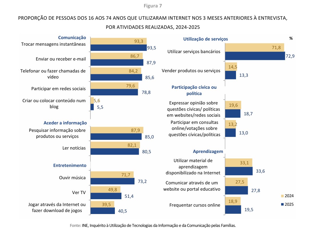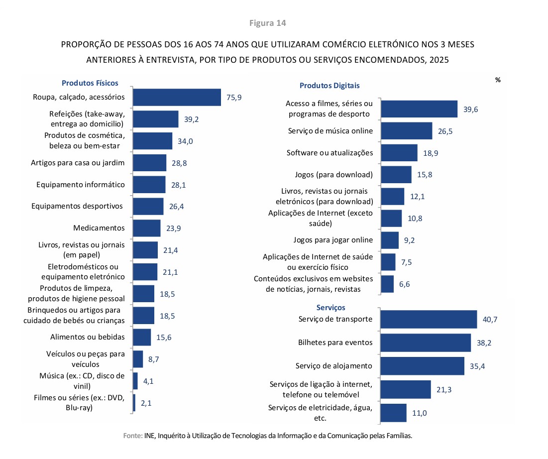 Os resultados do mostram também que 89,5% dos inquiridos dos 16 aos 74 anos utilizaram a Internet nos 3 meses anteriores ao inquérito, principalmente para comunicar e aceder a informação. Deste conjunto, 49,6% fizeram encomendas online, sobretudo de roupa, calçado e acessórios de moda (75,9%).