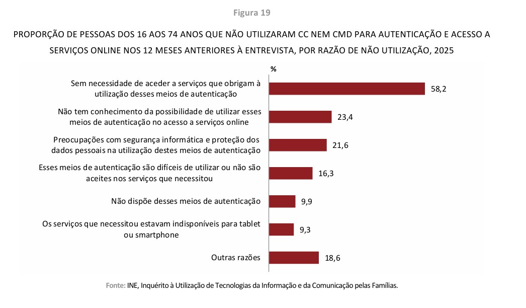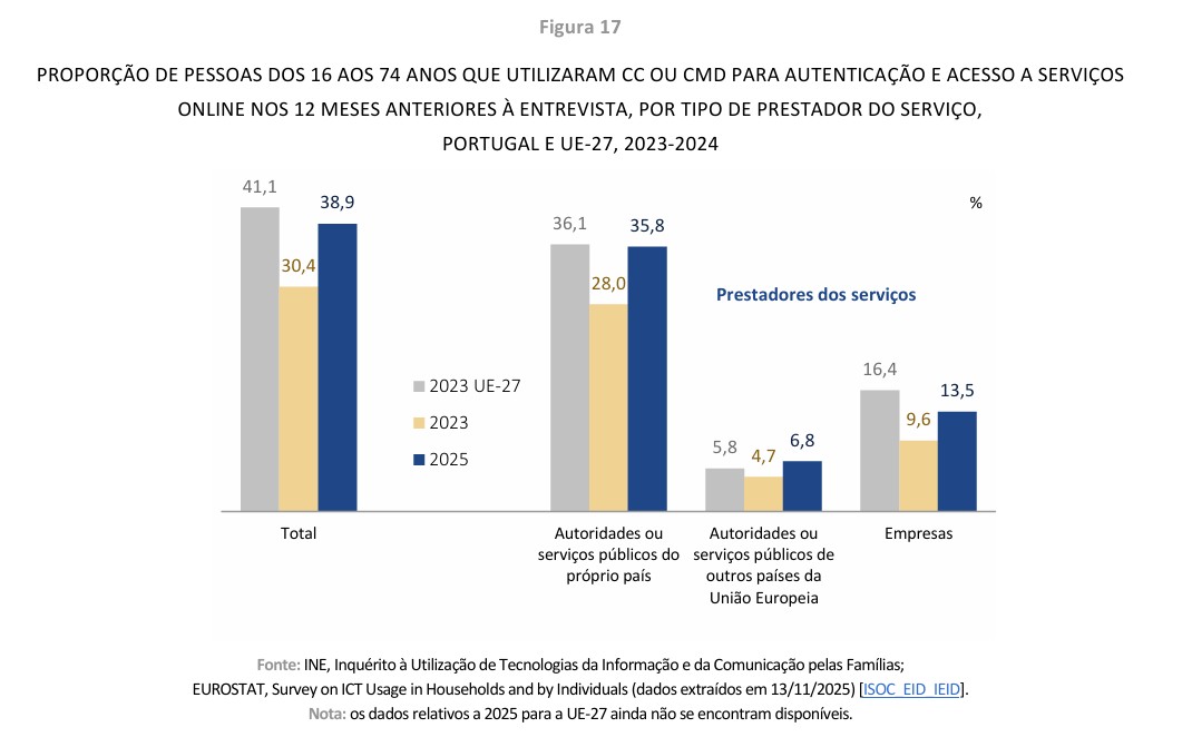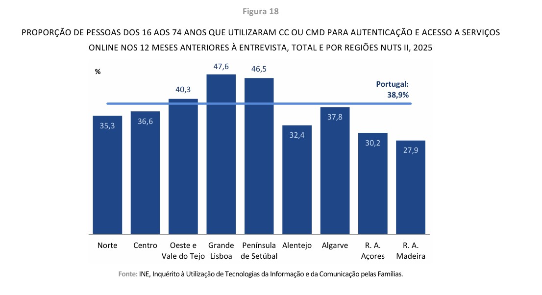 38,9% da população utilizou o Cartão de Cidadão ou a Chave Móvel Digital como meios de autenticação para aceder a serviços online nos 12 meses anteriores ao inquérito, numa subida de 8,5 pontos percentuais face a 2023.