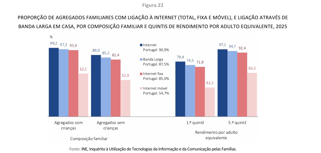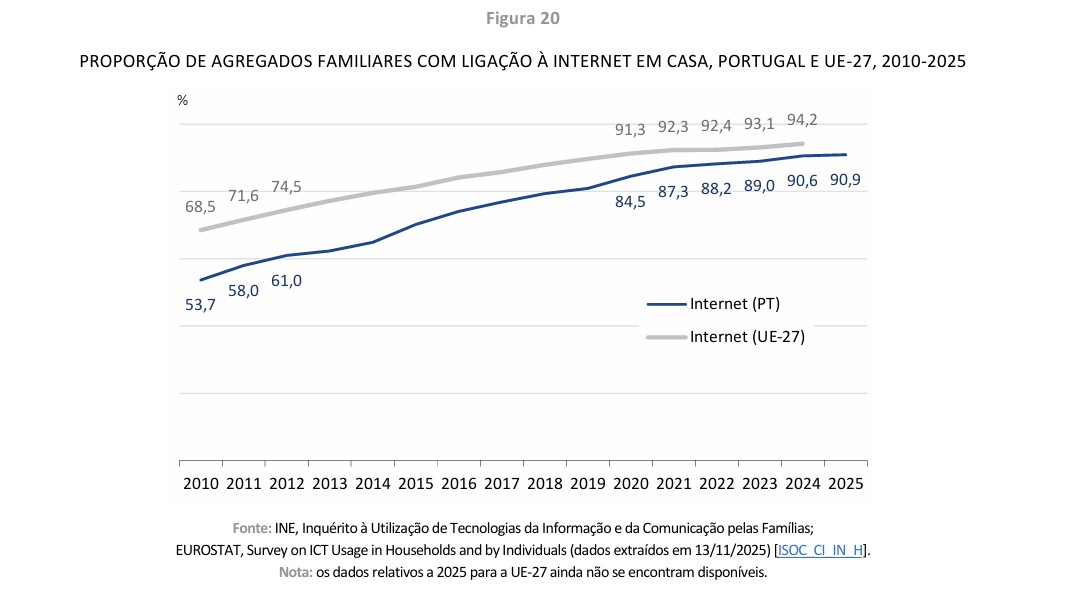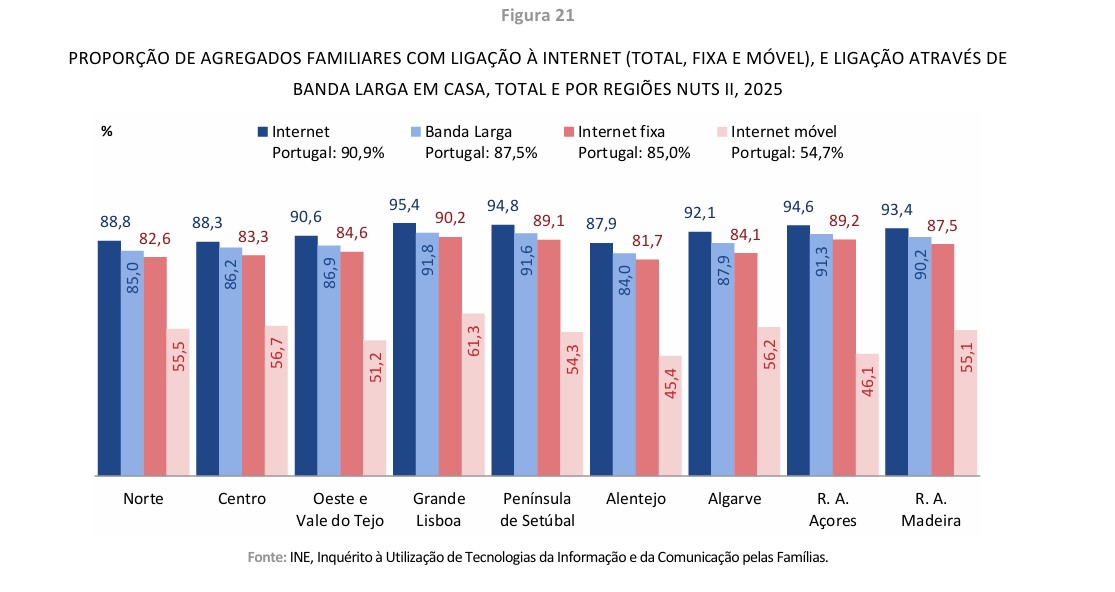 No que respeita ao acesso à Tecnologias da Informação e da Comunicação em casa, o inquérito indica que 90,9% dos agregados familiares contam com Internet nos seus lares, sendo usadas principalmente tecnologias fixas (85,0%).
