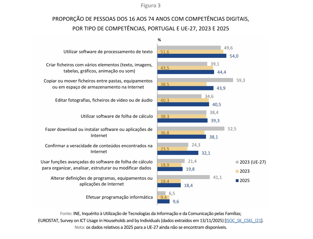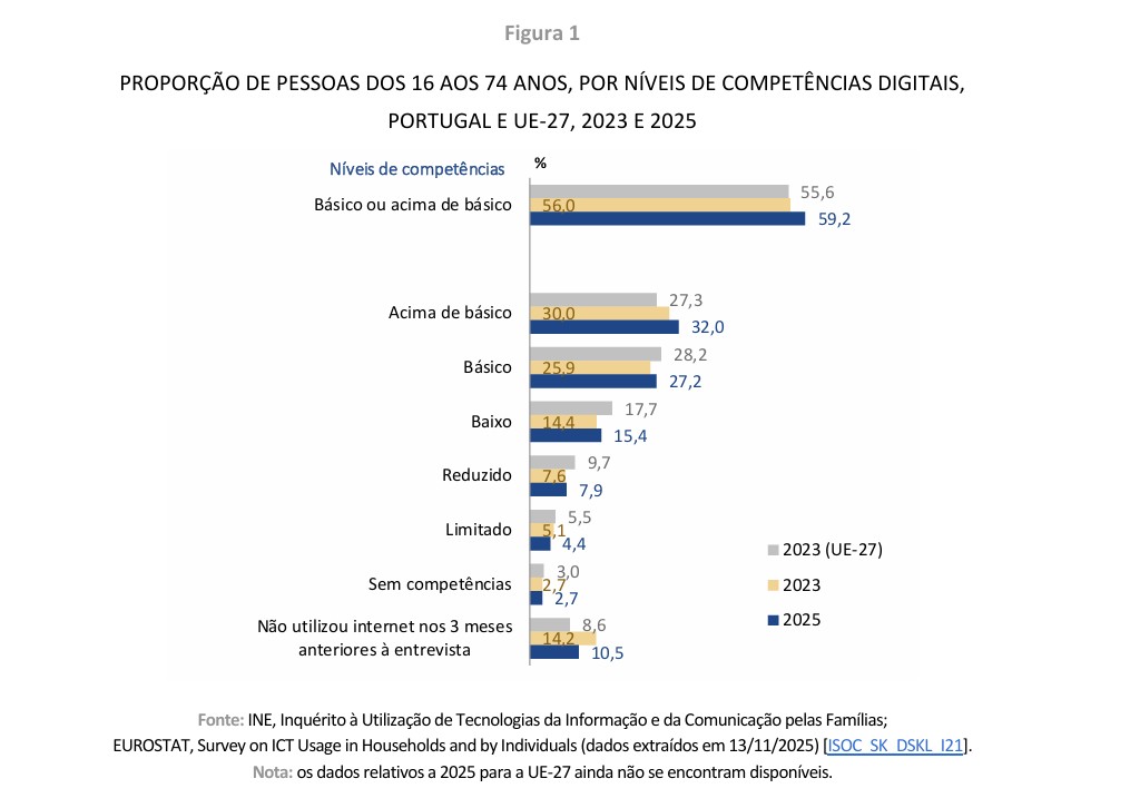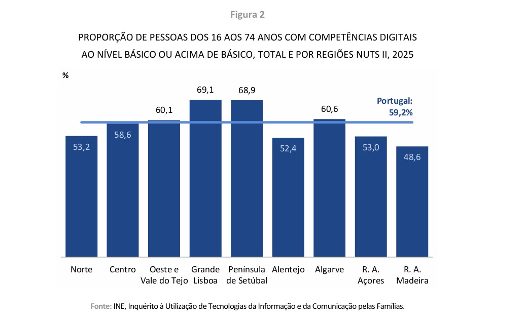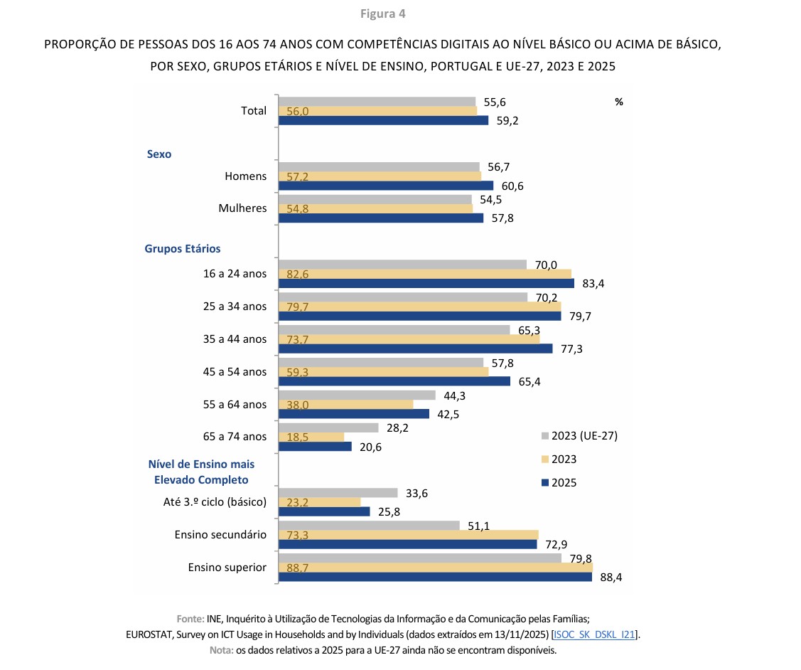 Os dados indicam que 59,2% das pessoas com 16 a 74 anos têm competências digitais ao nível básico ou acima do básico, sobretudo no caso da população dos 16 aos 24 anos (83,4%) e entre as pessoas que completaram níveis de ensino superior (88,4%).