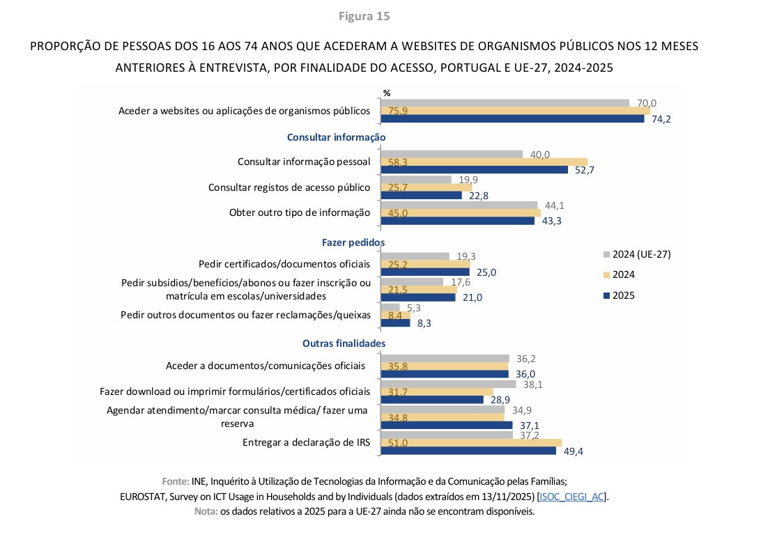 Nos 12 meses anteriores ao inquérito, 74,2% das pessoas acederam a websites ou aplicações de organismos públicos, maioritariamente para para consultar informação pessoal (52,7%).