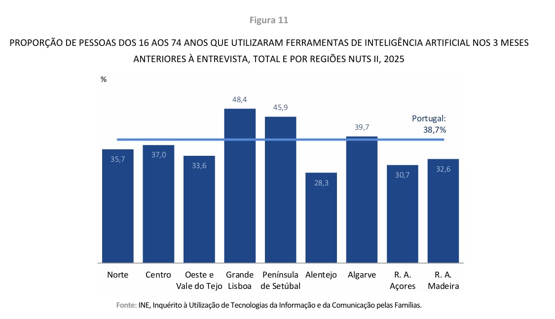 As regiões da Grande Lisboa (48,4%), da Península de Setúbal (45,9%) e Algarve (39,7%) afirmam-se como aquelas com maiores proporções de utilização de IA entre as pessoas dos 16 aos 17 anos. Por contraste, o Alentejo é a região com a proporção mais baixa (28,3%).