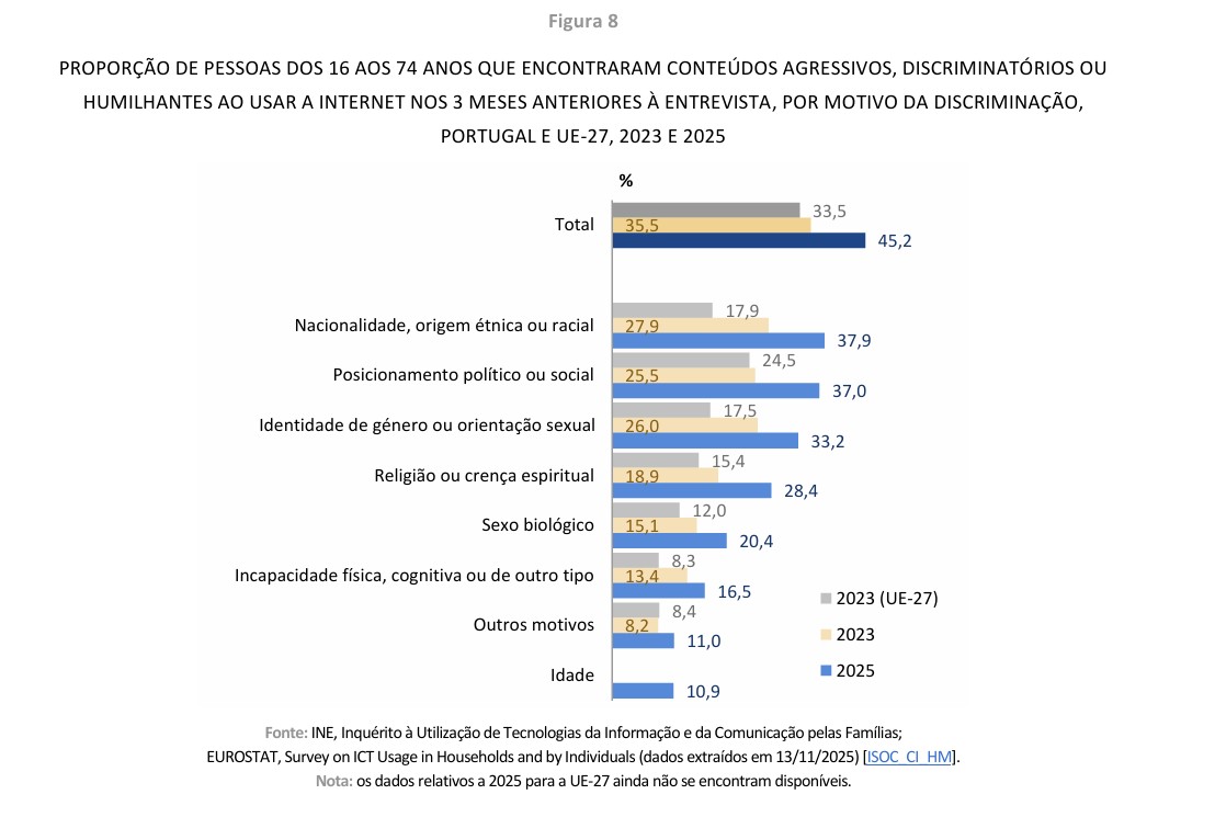 O relatório dá conta de um aumento na proporção de pessoas que encontraram conteúdos agressivos, discriminatórios ou humilhantes online, passando de 35,5% em 2023 para 45,2% em 2025.