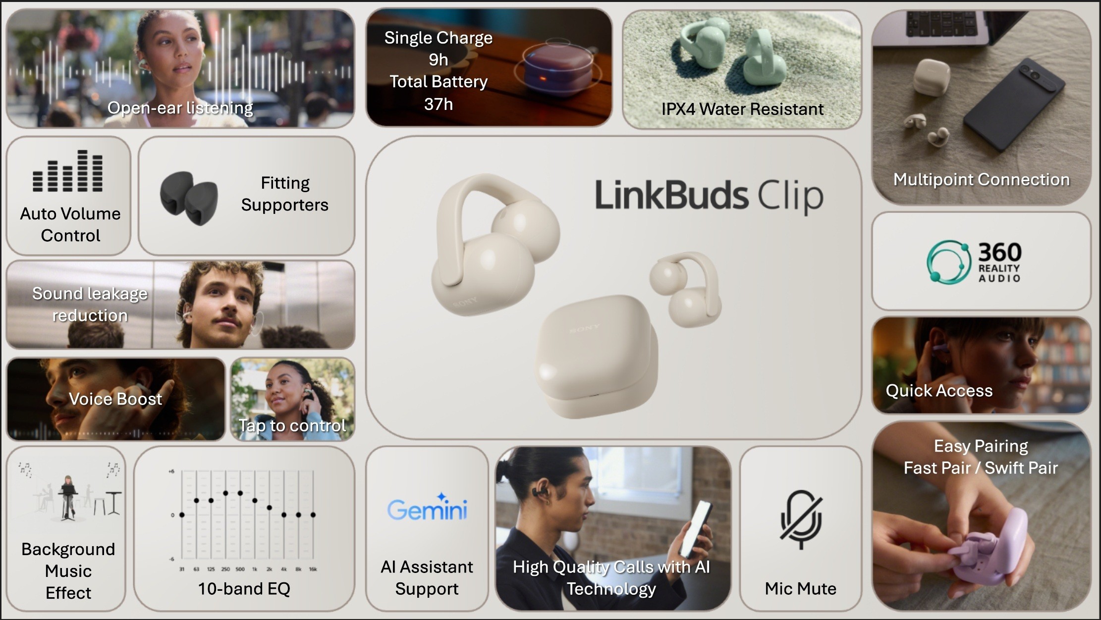 A bateria garante nove horas de utilização contínua nos auriculares (37 horas com a caixa de carregamento), e três minutos de carga garante uma hora de utilização. A certificação IPX4 protege-os contra salpicos e suor, e a funcionalidade Multipoint Connection permite alternar facilmente entre dispositivos ligados através da aplicação Sound Connect, que também gere os comandos de voz e configurações personalizadas. Os LinkBuds Clip terão um custo de 200 euros, e estarão disponíveis ainda durante o presente mês de janeiro.