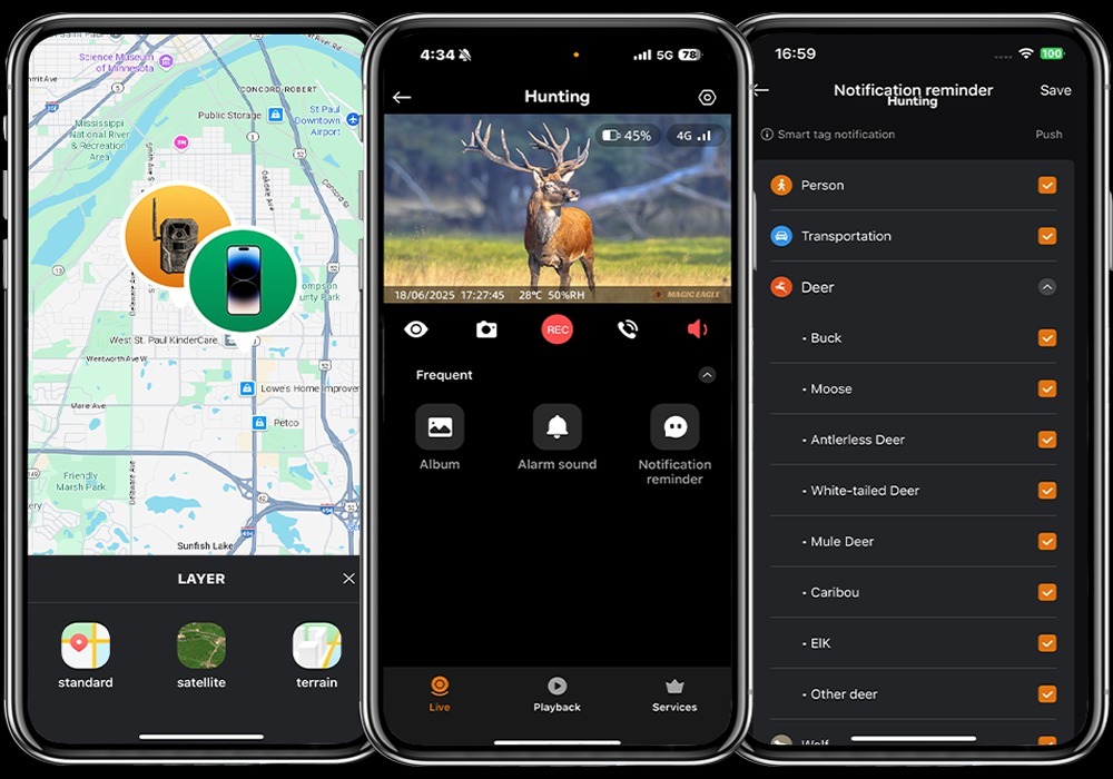 Para evitar a criação de notificações falsas causadas pelo movimento de vegetação, a Magic Eagle implementou um sistema de reconhecimento de espécies baseado em Inteligência Artificial. Esta tecnologia filtra movimentos irrelevantes e consegue identificar e catalogar as espécies captadas, enviando alertas apenas quando animais de interesse são detetados.