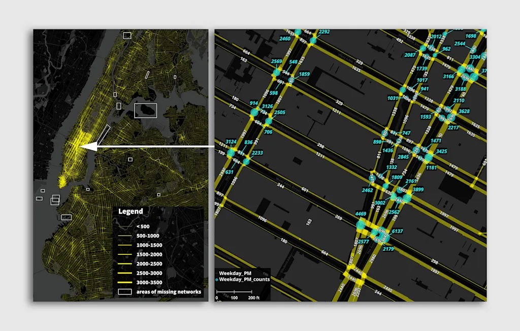 No caso da análise a Nova Iorque, ruas como a Broadway e a quinta avenida são corredores importantes, mas o modelo criado mostra que 26 ruas de bairros exteriores têm mais volume de pedestres do que 75% dos considerados como “corredores globais”. Mas são categorizados como de baixo nível, baseado em assunções e vieses, e portanto, não recebem o mesmo nível de tratamento.