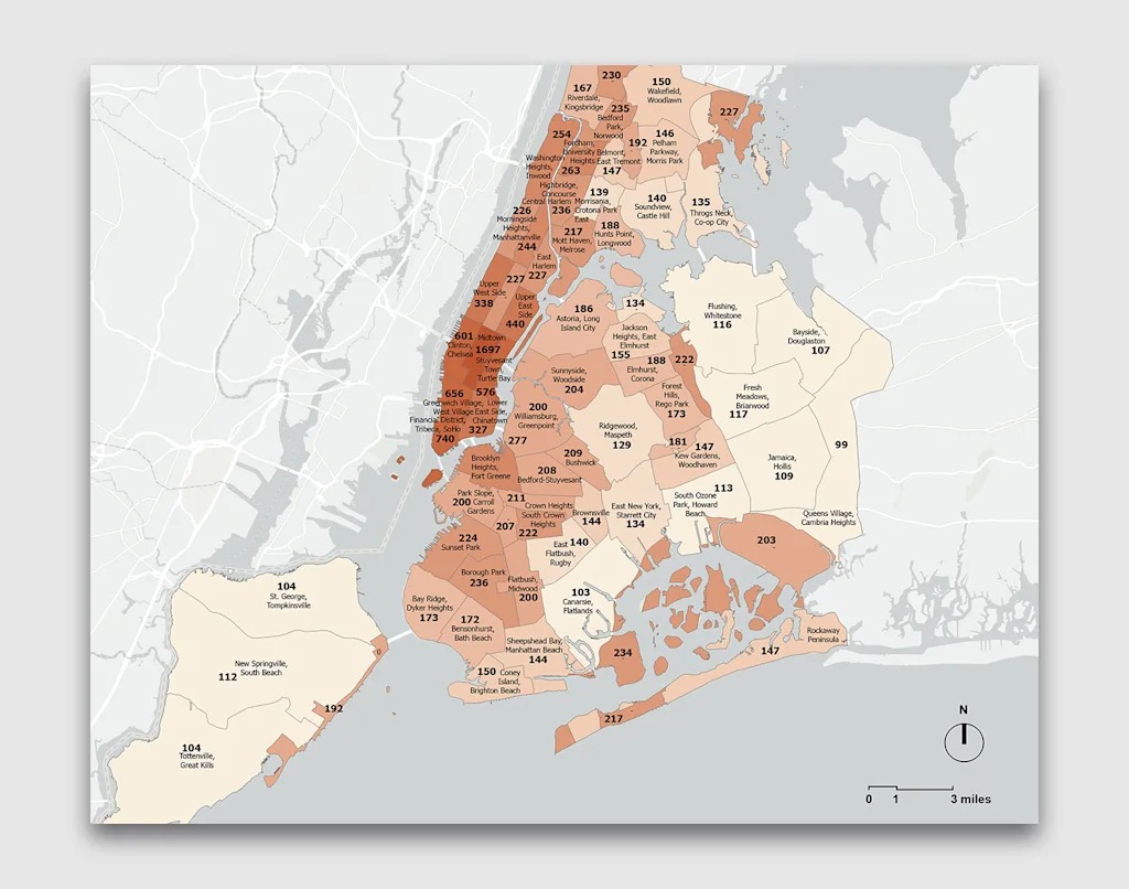 Muitas ruas nos bairros exteriores, como a Bronx, Staten Island, e regiões de Brooklyn e Queens apresentam níveis de tráfego pedonal semelhantes aos de Manhattan, mas continuam classificadas como vias de baixa prioridade para peões. Este desfasamento sugere também injustiças no investimento em infraestrutura pedonal, já que zonas com grande movimento continuam subvalorizadas.