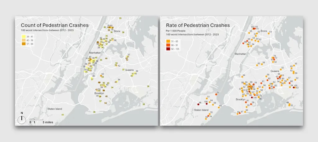 Ao ligar os volumes de pedestres com os dados de acidentes, os investigadores afirmam que as interseções com maior risco de perigo não estão em Manhattan, mas sim nos bairros exteriores. A investigação demonstra ainda que a análise do volume de pedestres pode revelar padrões escondidos de acessibilidade, desigualdade e risco, que podem ajudar no planeamento das cidades no futuro.