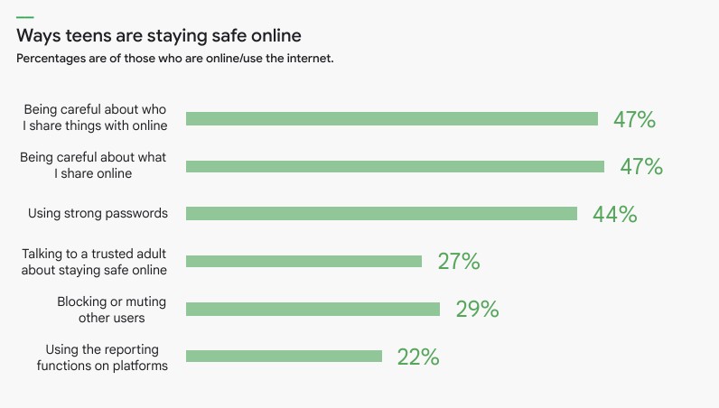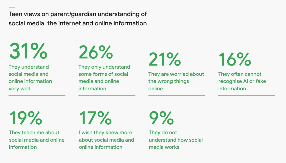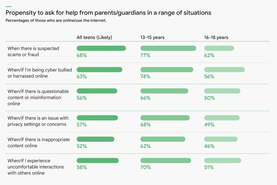 Os dados indicam que, à medida que crescem, os jovens tornam-se cada vez menos dependentes dos pais e familiares. Por exemplo, 54% dos participantes entre os 13 e 15 anos recorrem aos pais para aprender boas práticas online. Por outro lado, esta percentagem desce para 19% no caso dos adolescentes entre os 16 e 18 anos.