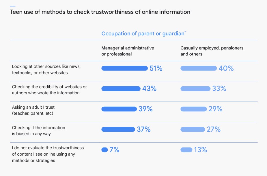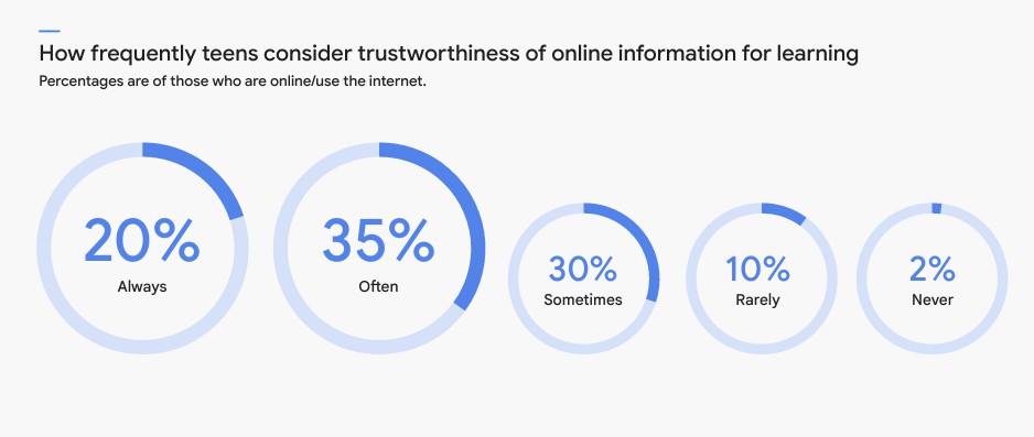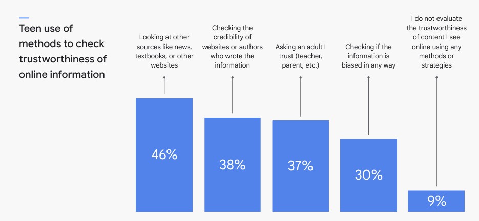 O estudo aponta que os jovens inquiridos sabem que não devem acreditar em tudo o que vêem online. 55% afirmam que avaliam se o conteúdo que encontram é de confiança e 46% indicam que verificam a informação em outras fontes.