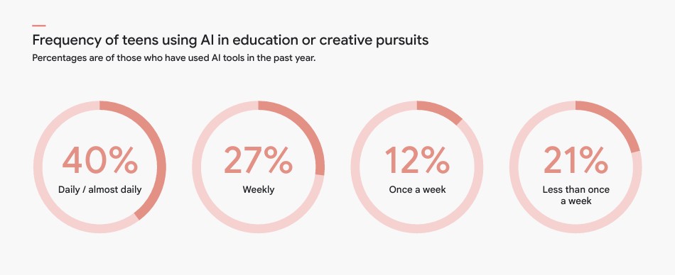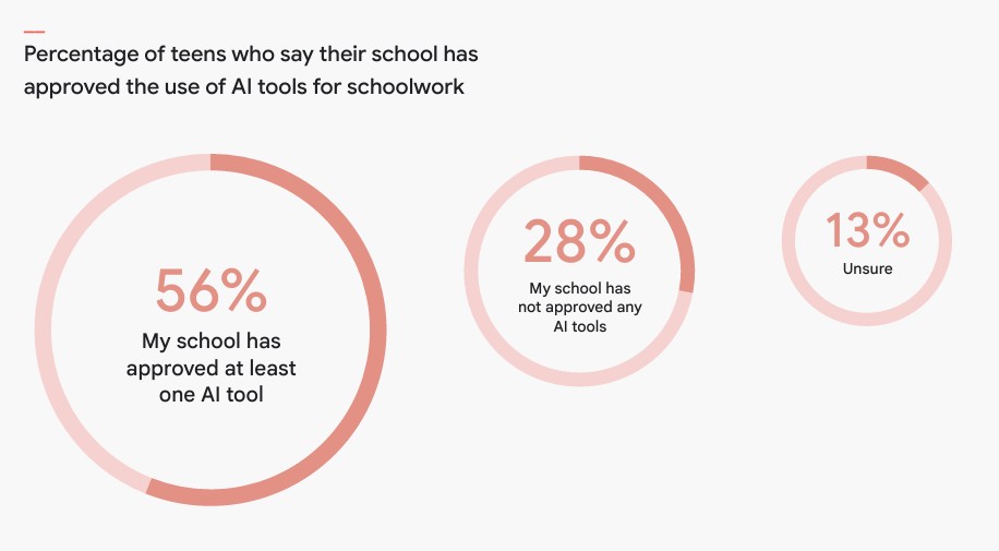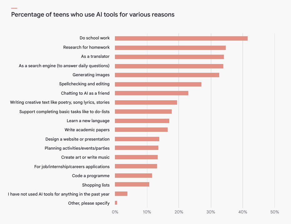 Mais de 40% dos jovens usam IA para ajudar nos trabalhos da escola. Embora 56% dos participantes indiquem que as suas escolas aprovaram o uso de pelo menos uma ferramenta “alimentada” por esta tecnologia, 28% afirmam que as instituições de ensino que frequentam ainda não tomaram esse tipo de medidas.
