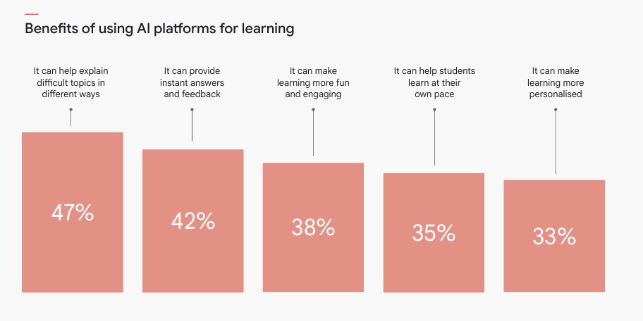 De acordo com os dados partilhados, 81% dos jovens que usam IA afirmam que a tecnologia melhora a sua criatividade. Para 65% dos participantes, as ferramentas inteligentes ajudam a encontrar novas ideias ou soluções para problemas e, para 47%, são úteis quando se trata de explicar tópicos complexos.