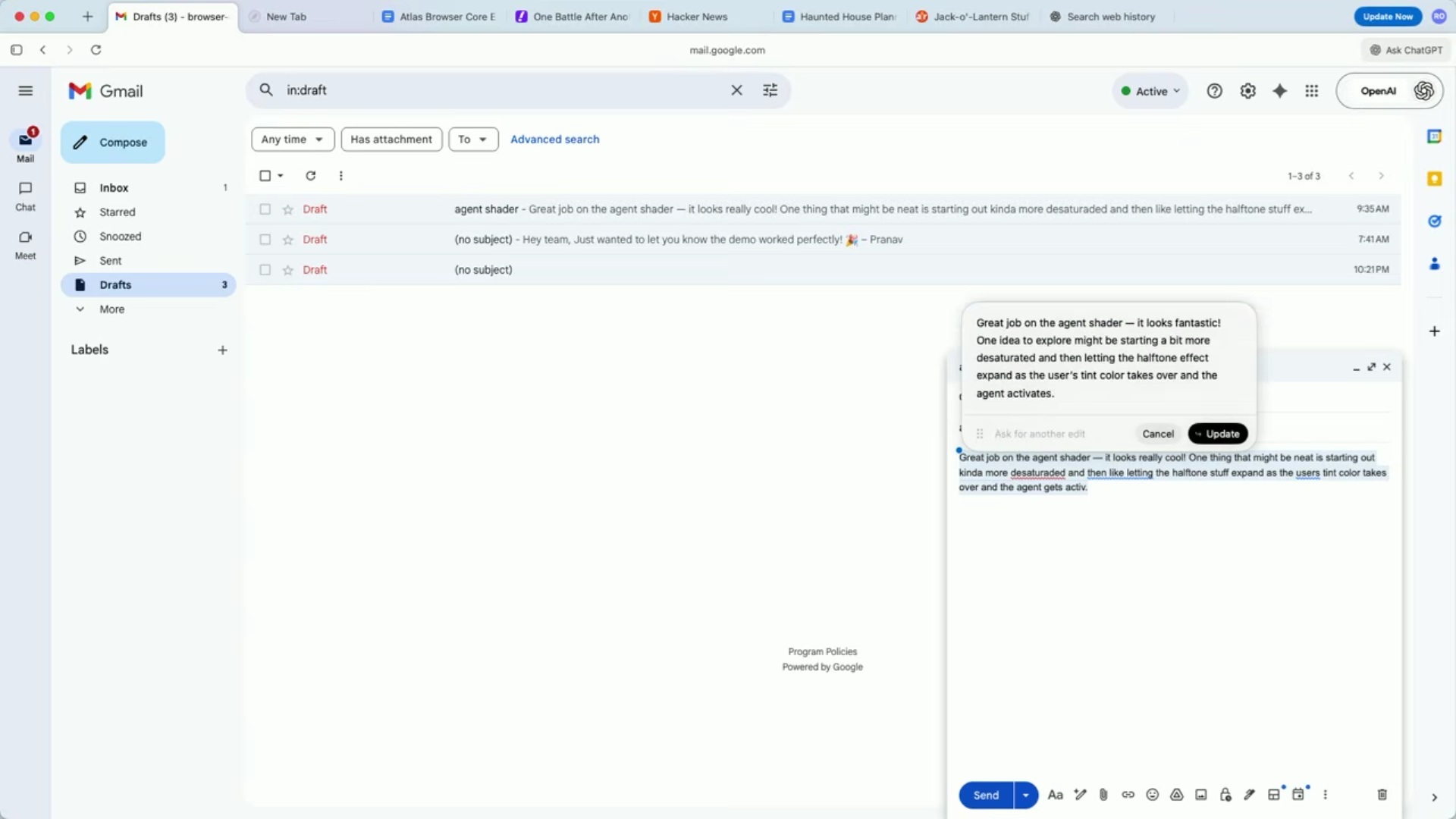 Fora da pesquisa, o ChatGPT Atlas quer também agilizar a experiência de usar o popular chatbot para refinar mensagens enviadas, por exemplo, através do Gmail. Em vez de copiar o texto para o ChatGPT e pedir para o tornar mais formal ou simples, basta selecionar diretamente o conteúdo do email que está a escrever no serviço da Google, clicar um botão e indicar o pedido que tem em mente.
