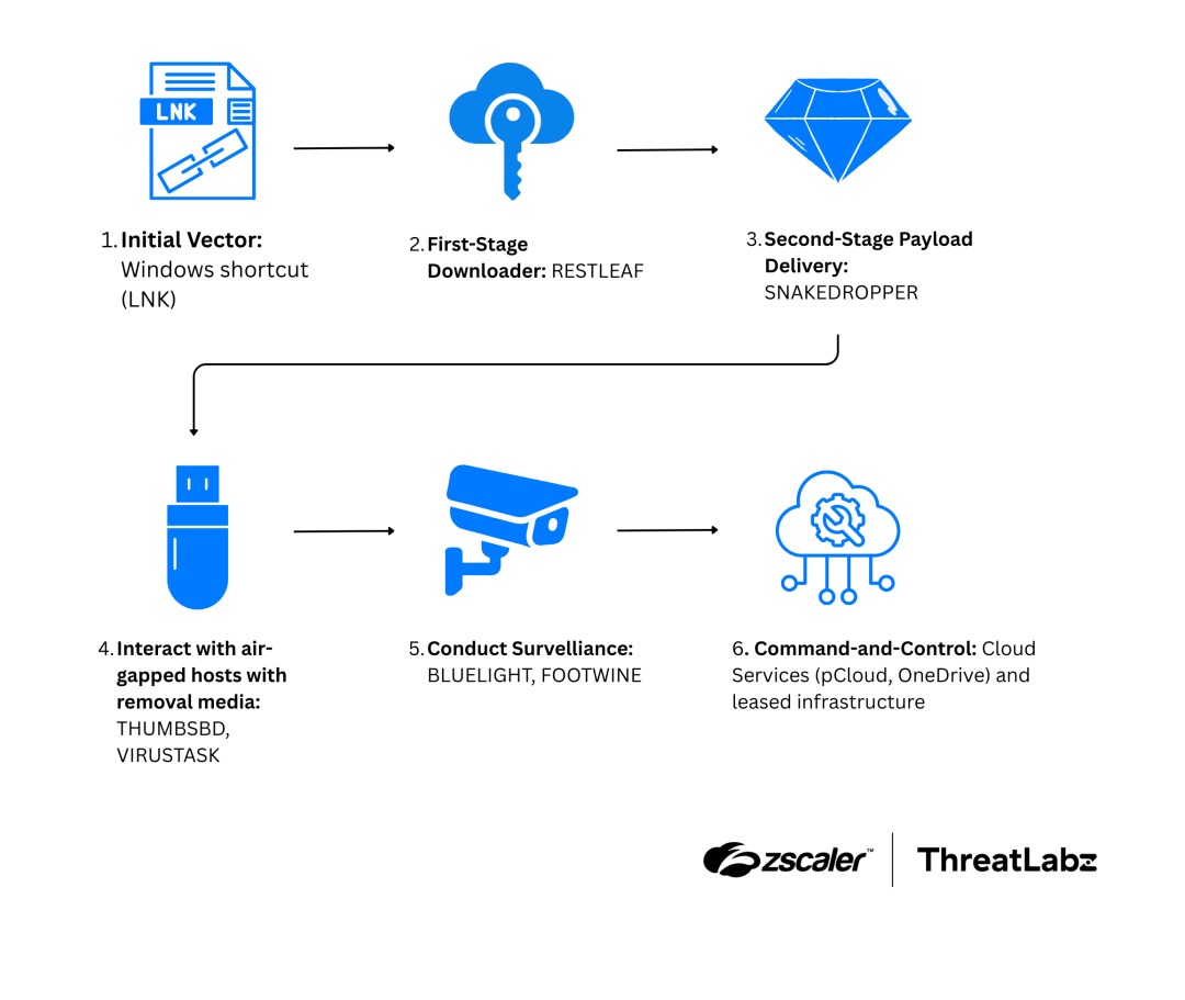 O estudo mostra as diferentes ferramentas utilizadas nesta campanha maliciosa, incluindo o backdoor já conhecido Bluelight, usado como payload adicional para o controlo e exfiltração de dados via serviços de cloud. O Footwine que é um backdoor avançado com capacidades de vigilância através de keylogging, imagens, áudio e vídeo. O Virustask é o mecanismo usado de propagação via USB, substituindo os ficheiros por atalhos maliciosos para comprometer novos hosts.