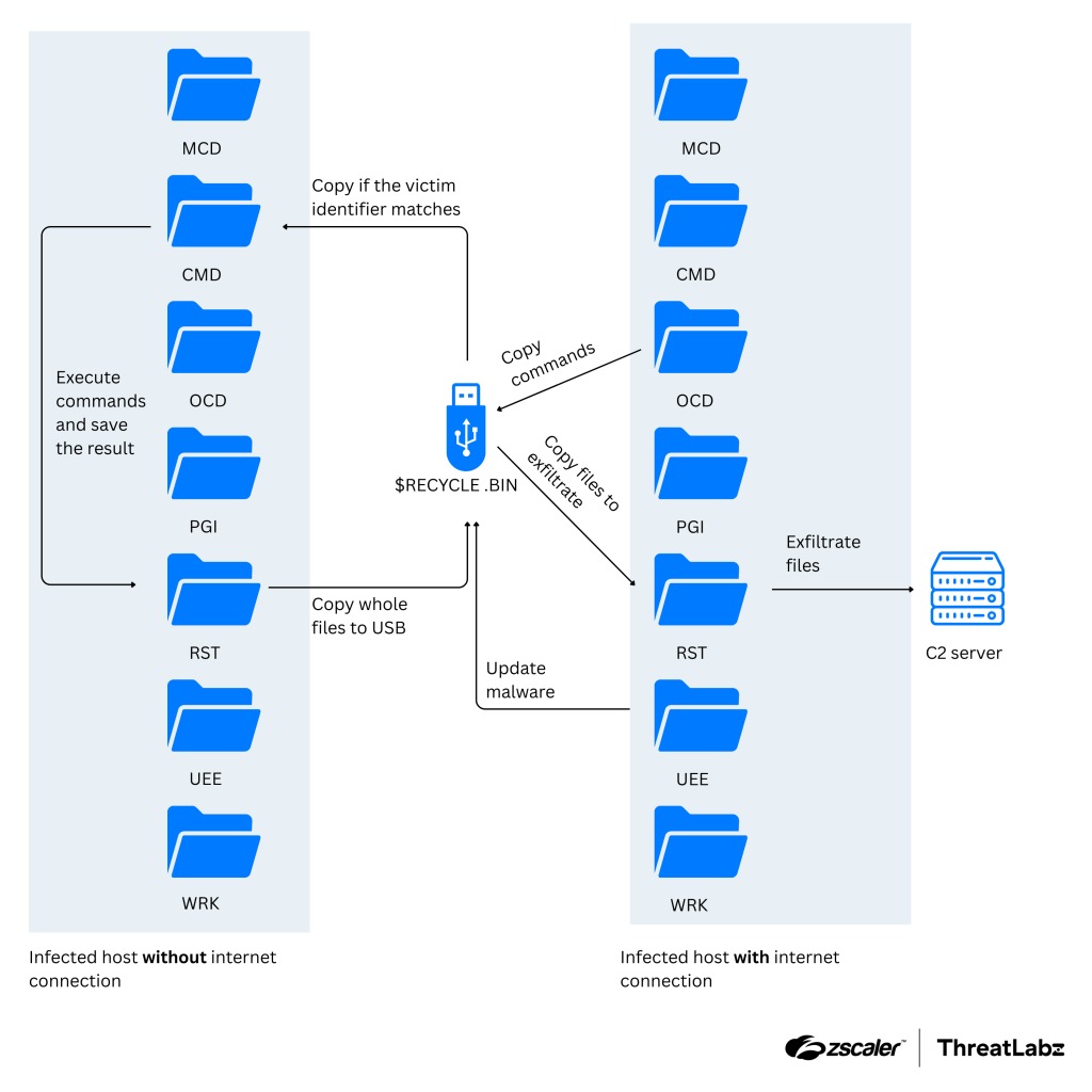 Durante o processo, o sistema cria uma pasta oculta chamada RECYCLE.BIN no computador infetado, onde vai armazenando os ficheiros sensíveis. Quando deteta uma pendrive num equipamento isolado, o malware copia-os para o seu armazenamento. Quando ligada novamente a um computador com ligação online, o malware lê esses ficheiros e envia-os para um servidor controlado pelos hackers.