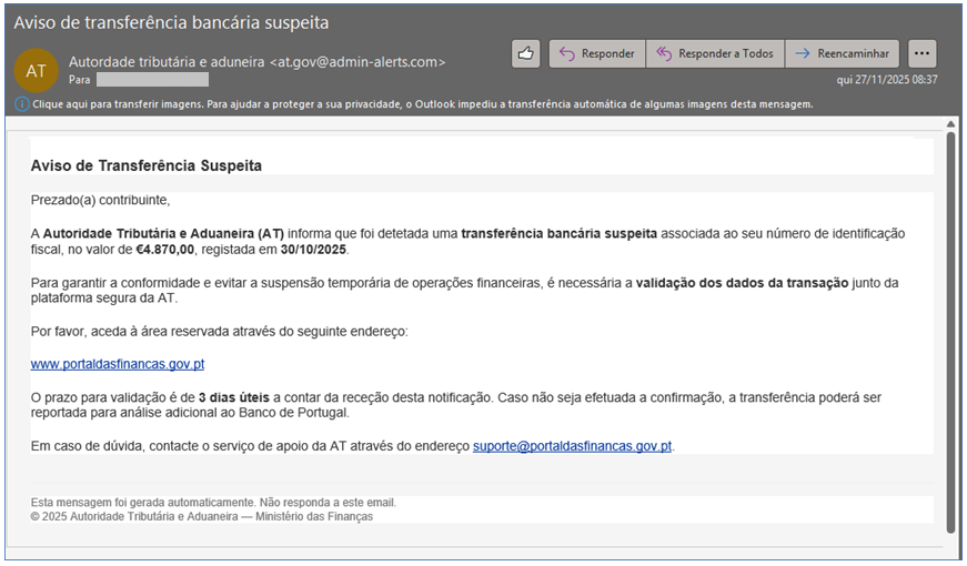 Ainda no final do mês de novembro a Autoridade Tributária tinha avisado para uma nova fraude de phishing, por email e SMS, partilhando imagens de exemplo.