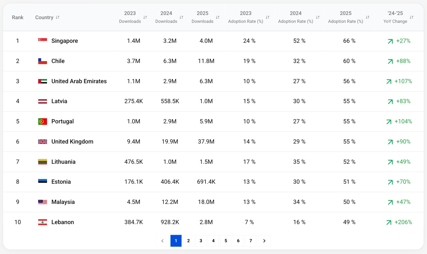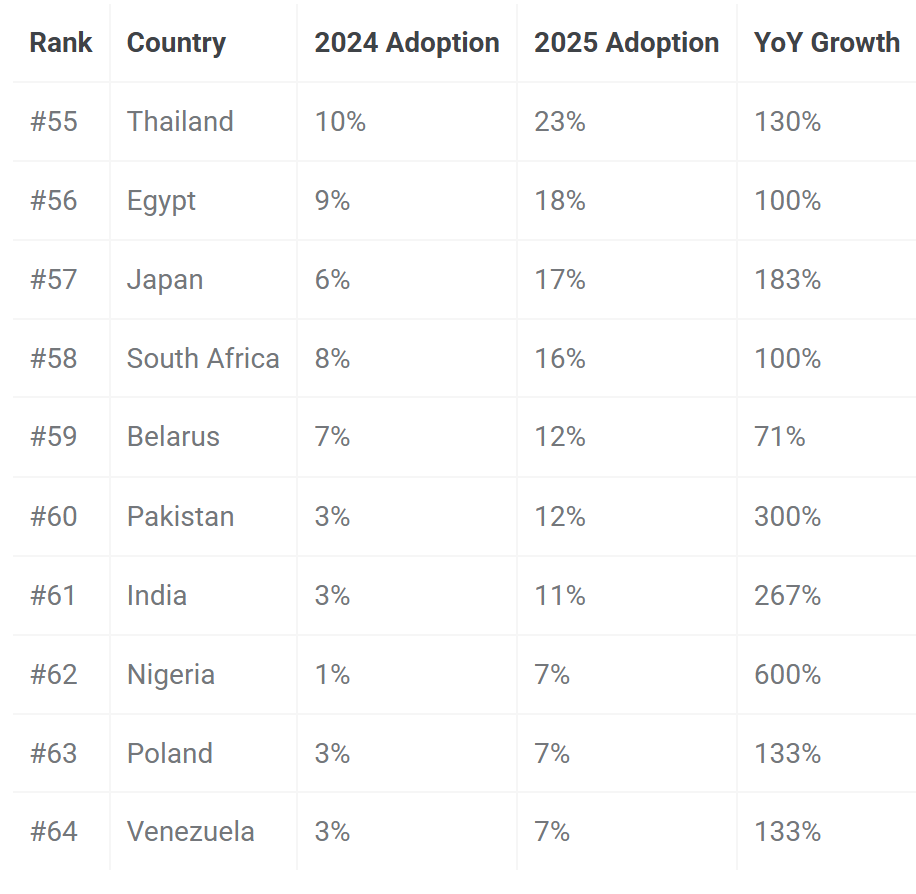Os Emirados Árabes Unidos fecham o “pódio” com uma taxa de adoção que passou dos 10% em 2023 para 27% em 2024, crescendo para os 56% no ano passado. O crescimento a nível de downloads entre 2024 e 2025 foi ainda mais expressivo (107%), passando de 2,9 milhões para 6,3 milhões.