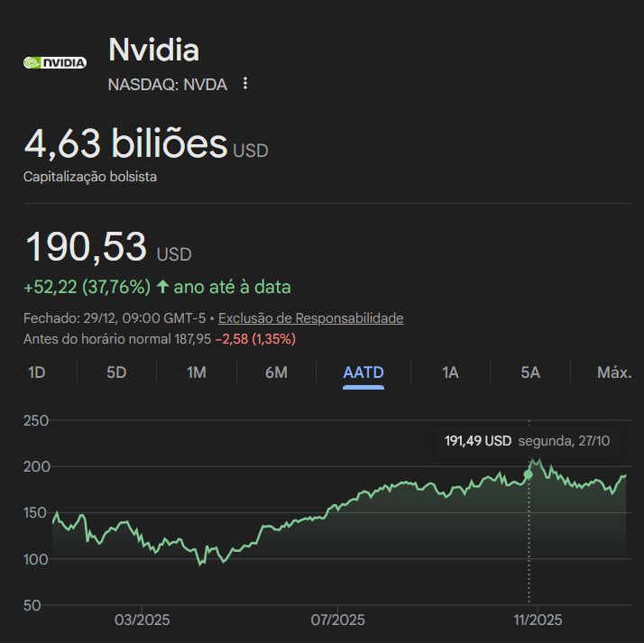 Voltando à IA, muitas vozes continuam a lembrar que a seguir a uma subida há-de vir a descida e que podemos estar na iminência de chegar a uma fase de descidas vertiginosas. Os receios de que a bolha à volta da IA exploda em breve têm pairado ao longo do ano e devem seguir para 2026. São aliás estes receios que explicam que, a mesma Nvidia que ainda em julho passou a valer mais de 4 biliões, quatro meses depois, em novembro, quase tenha chegado aos 5 biliões. E que pouco mais de um mês depois já esteja novamente no limiar dos 4 biliões. Abriu esta última semana do ano, a valer 4,63 biliões de dólares. Já valorizou quase 38% desde o início do ano.