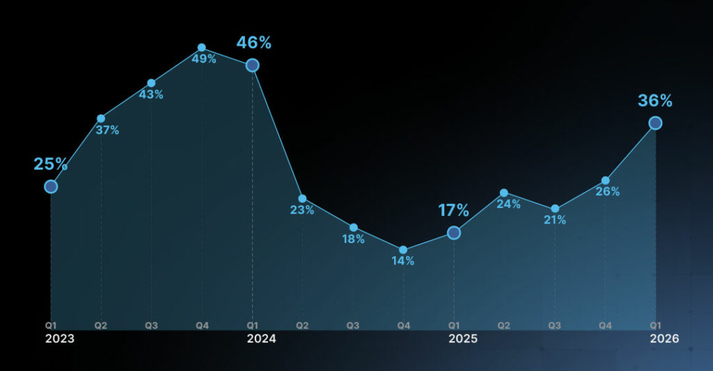 Segundo os dados avançados pela Experis, há um crescimento nas intenções de contratação dos empregadores do setor tecnológico em Portugal para o primeiro trimestre de 2026, com a Projeção para a Criação Líquida de Emprego a situar-se nos 36%.