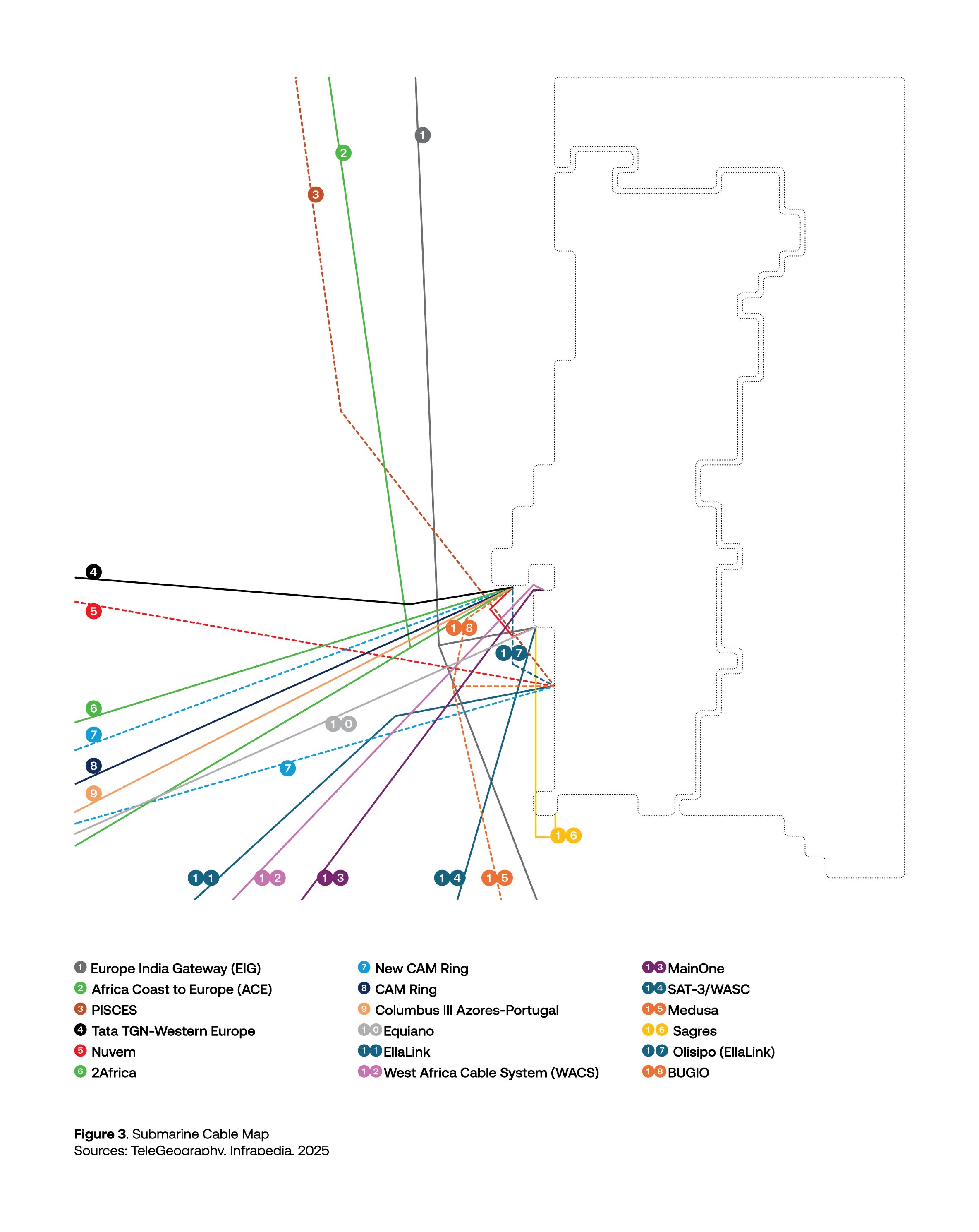 A localização geográfica privilegiada e a conetividade das redes de fibra ótica, assim como da amarração de cabos submarinos que ligam o país à Europa, América do Norte e América do Sul, África e Ásia, fazem parte da equação que impulsiona o crescimento do sector. Luis Duarte sublinha as vantagens de Portugal ter um gateway digital único com os cabos EllaLink, o Equiano, o 2Africa e os futuros Nuvem, Medusa e PISCES que contribuem para melhorar significativamente a conectividade internacional de Portugal, num ecossistema que é reforçado pelos novos Internet Exchange Points (IXPs) e os IP Transit Providers Tier1.