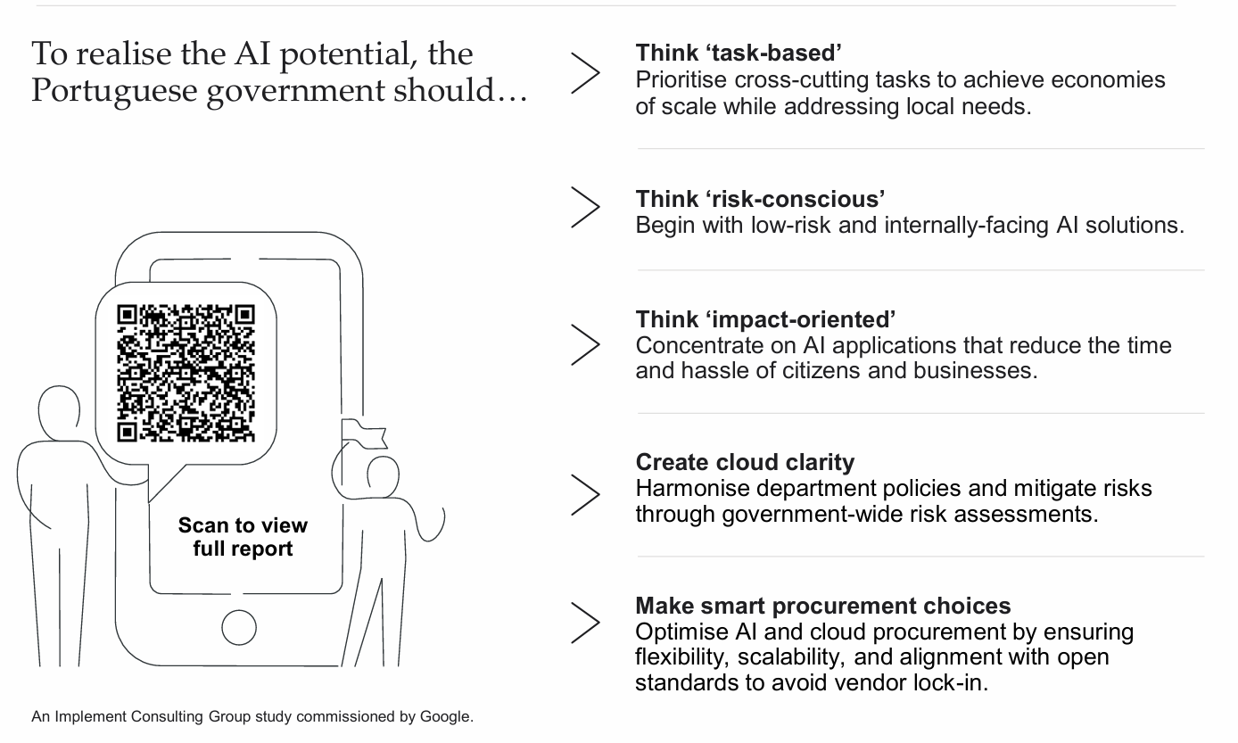 O relatório inclui algumas recomendações para que o impacto da IA Genertiva seja maximizado na Administração Pública, nomeadamente com a priorização de tarefas transversais para alcançar escala em soluções de IA.