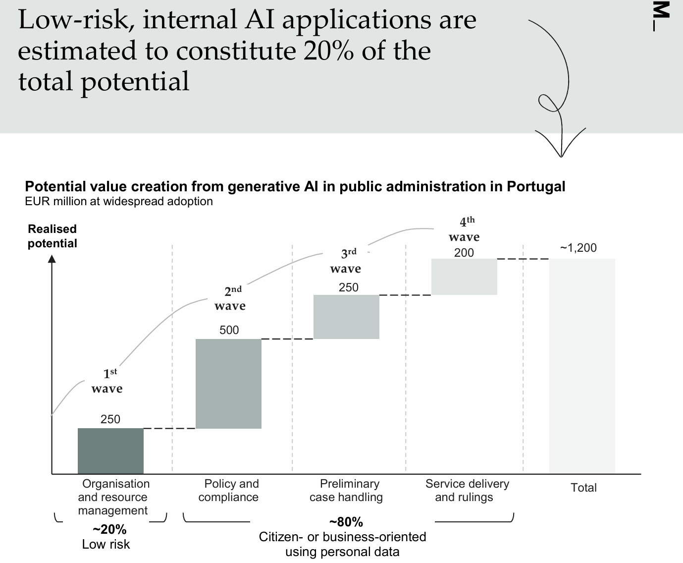Segundo o estudo 20% do potencial de aplicação está centrado em aplicações de IA internas, de baixo risco, que podem ser implementadas numa primeira fase, mas soluções orientadas ao cidadão, tirando partido dos dados, são 80% do potencial e podem ser geridas em várias fases, com ganhos significativos.