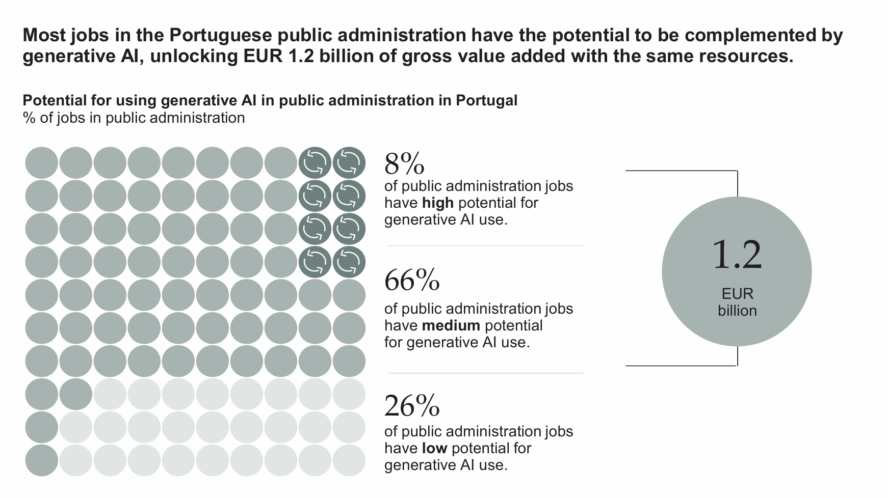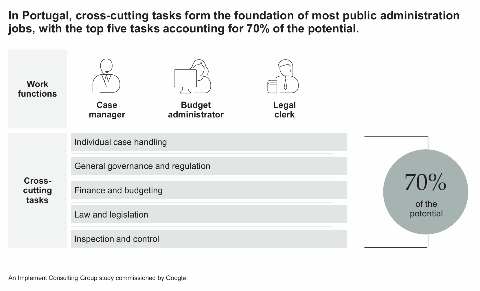 A análise realizada calcula que a maioria dos processos e empregos podem ser melhorados com o apoio da IA e indica que 66% dos funcionários (aproximadamente 200.000 pessoas) poderiam ver as suas tarefas diárias otimizadas, permitindo-lhes dedicar mais tempo a dar um apoio mais próximo aos cidadãos e a resolver problemas complexos, como documentos em falta em pedidos de nacionalidade, redigir textos legais e redirecionar casos para o departamento certo.