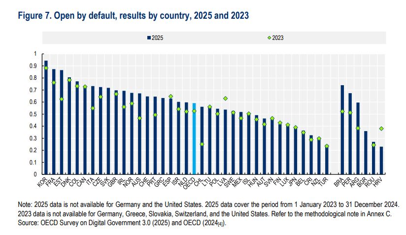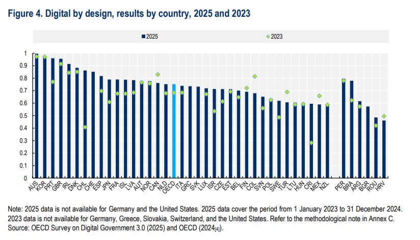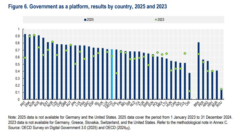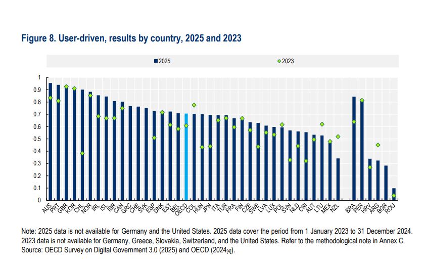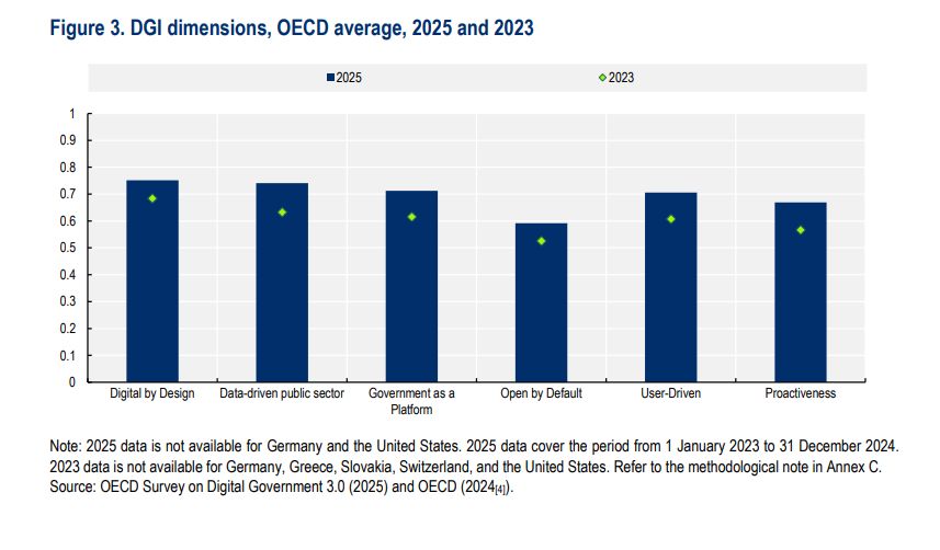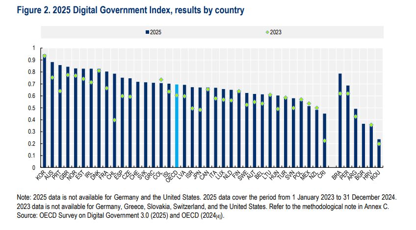 Em termos gerais, os avanços dos países da OCDE nesta matéria em 2025 foram modestos. O desempenho geral aumentou para 0,53 (de 1,0) em comparação com 0,48 em 2023, uma melhoria de 10%. O mesmo acontece no que refere ao Índice de Governo Digital, com os países monitorizados a aumentaram o seu desempenho para 0,70 (de 1,0), em comparação com 0,61 em 2023. É um aumento de 14%.