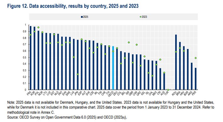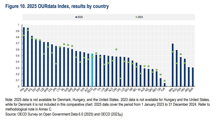 Os países com as pontuações mais altas no Índice OURdata de 2025 são França, Coreia, Polónia, Estónia e Espanha, considerados aqueles que têm políticas de dados governamentais abertos e esforços de implementação mais abrangentes.