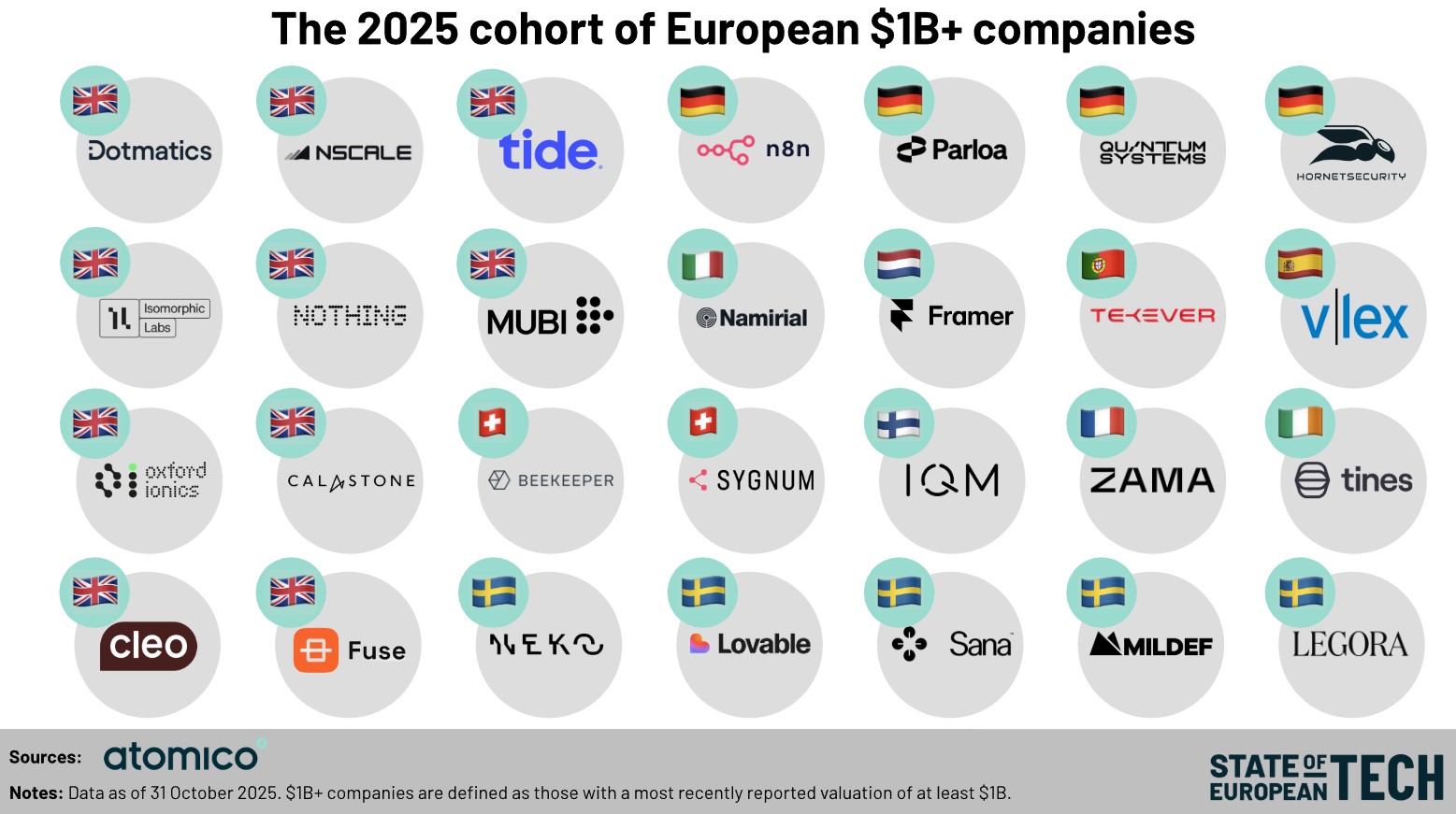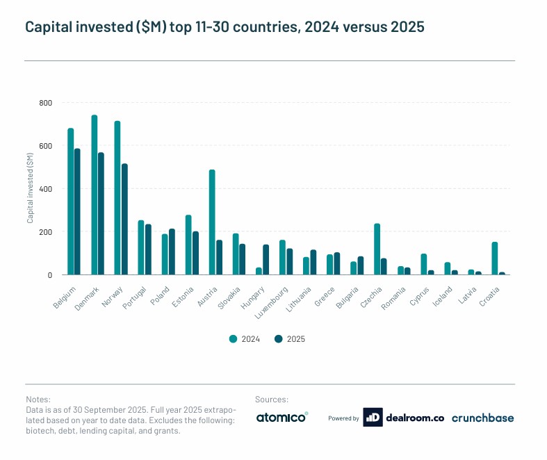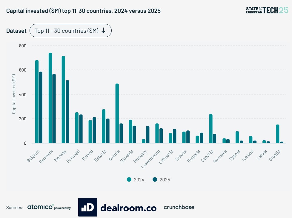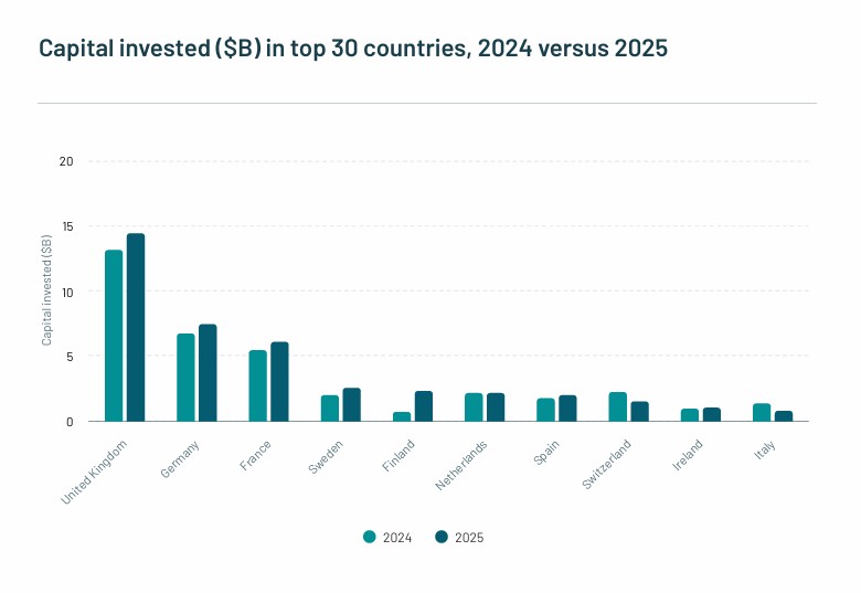 Apesar da expansão do sector tecnológico europeu, o ritmo de investimento em startups não tem sido uniforme entre países. O Reino Unido manteve a liderança, registando um aumento de 22% no volume de investimento, para 14 mil milhões de dólares, em 2025. Países como a Alemanha, Suécia e Finlândia também apresentaram fortes crescimentos face ao ano anterior.