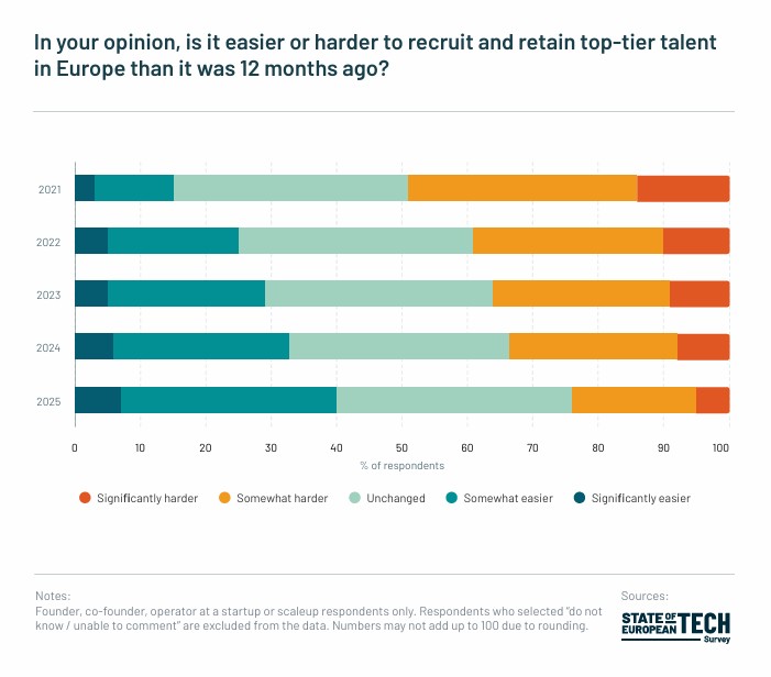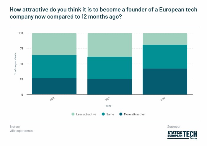 Além disso, 81% dos fundadores europeus na área da IA permanecem agora na Europa, versus 74% em 2016. A confiança está também a aumentar, com 42% dos inquiridos a afirmarem que hoje é mais atraente tornar-se fundador na Europa. Em Portugal, 35% dos inquiridos estão mais otimistas quanto ao futuro da tecnologia europeia do que estavam em 2024, enquanto 38% mantêm a mesma perspetiva.