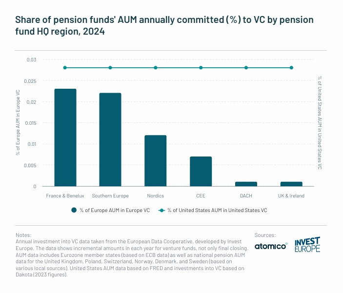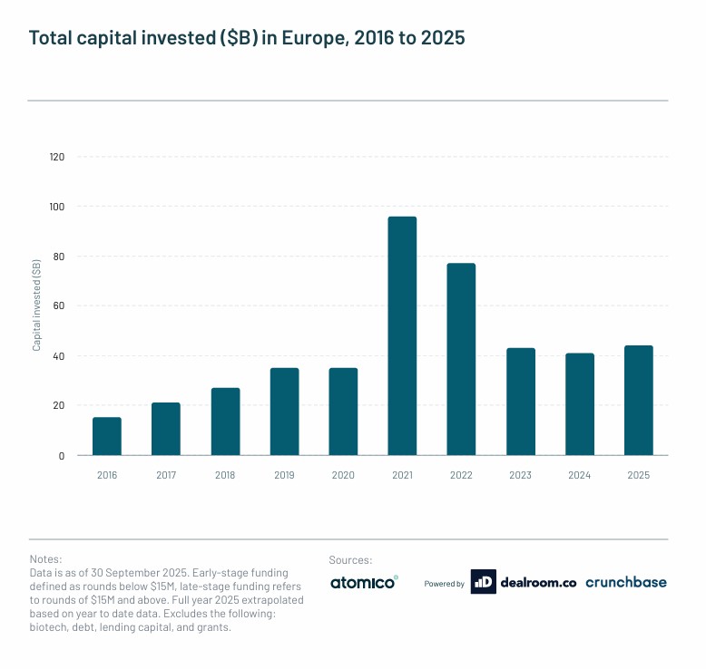 Em 2025, o investimento em capital de risco europeu cresceu 7%, para 44 mil milhões de dólares, enquanto os fundos de pensão aumentaram as suas alocações em 55%, de 650 milhões de dólares para mil milhões de dólares.