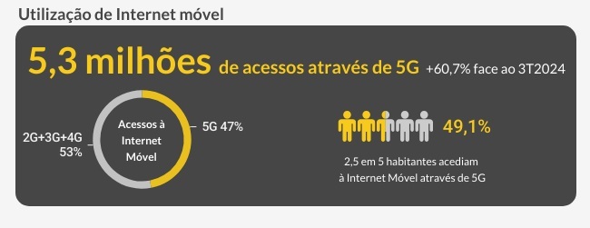 Segundo os dados, a taxa de penetração de acessos à Internet móvel através de 5G atingiu os 49,1 por 100 habitantes. Durante o período em análise, o tráfego em redes 5G representou cerca de 22,1% do total de tráfego de dados móveis, atingindo os 8,4 GB mensais por utilizador de Internet móvel 5G.